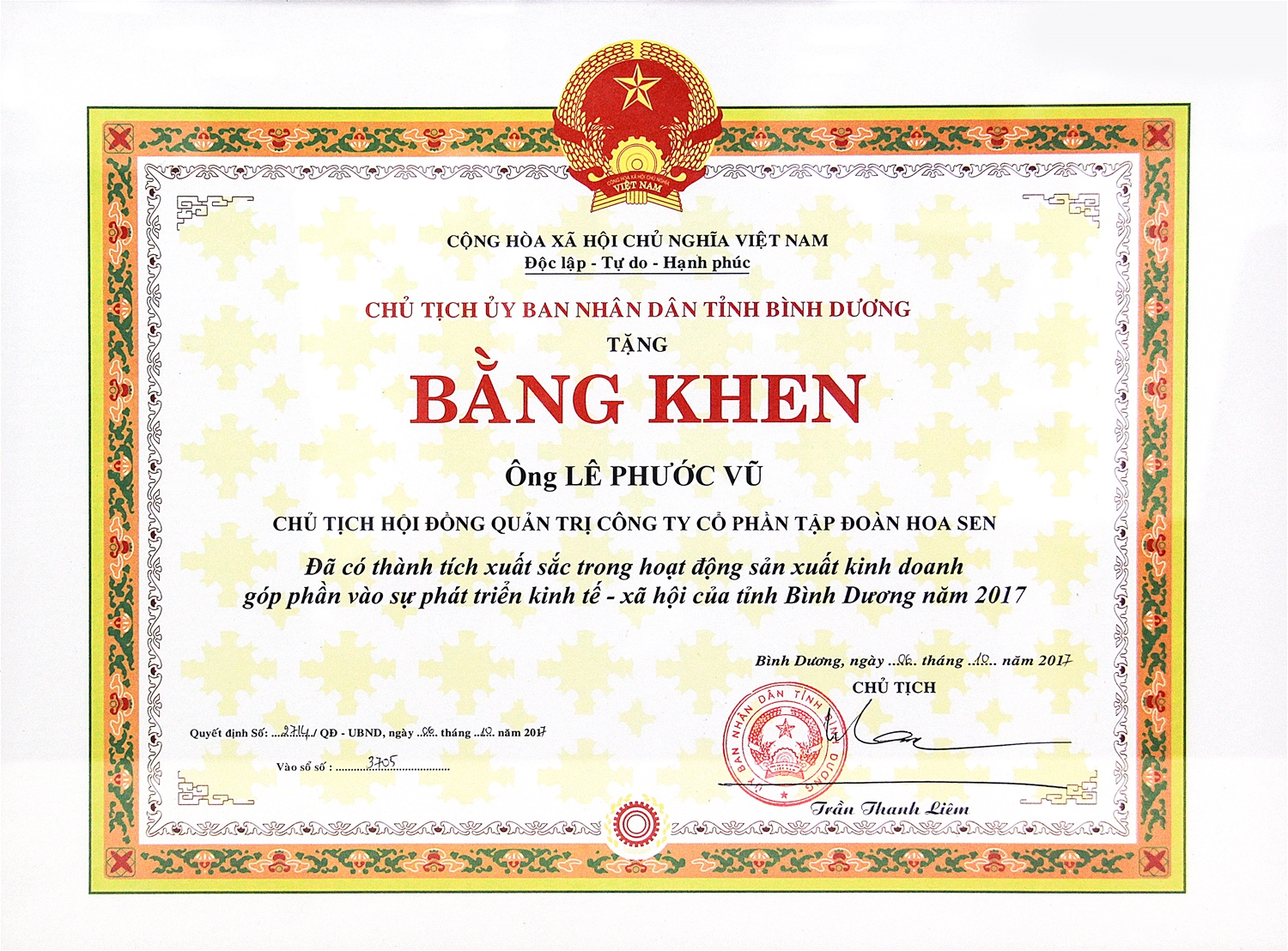 Certificate of merit from Binh Duong People’s Committee awarded to Mr. Le Phuoc Vu, Chairman of Board of Directors of Hoa Sen Group