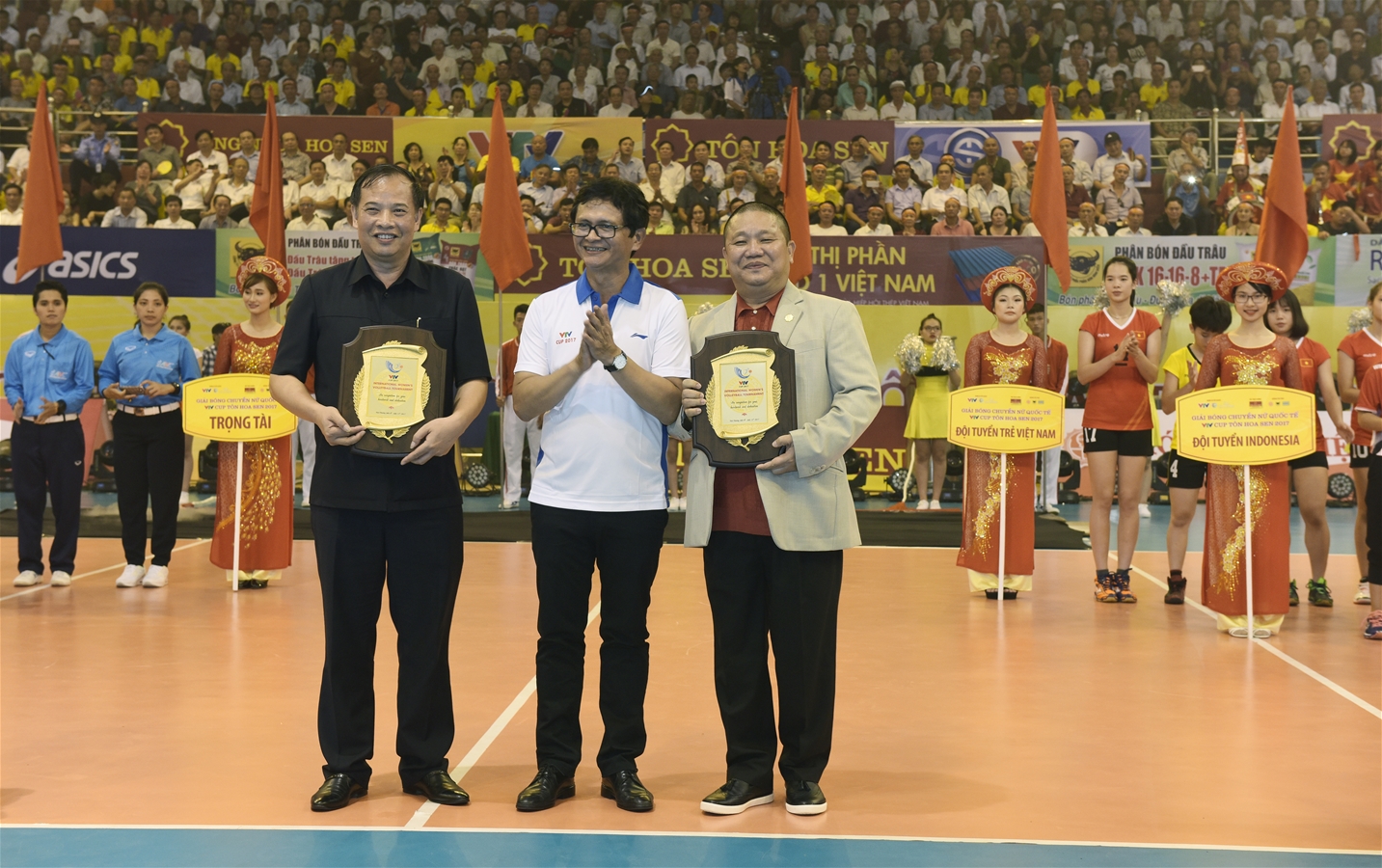 Ông Trần Bình Minh (đứng giữa) – Tổng giám đốc Đài THVN, Trưởng Ban chỉ đạo Giải bóng chuyền nữ quốc tế VTV Cup Tôn Hoa Sen 2017 trao kỷ niệm chương cho đại diện của đơn vị chủ nhà đăng cai giải đấu: ông Nguyễn Mạnh Hiển (bìa trái) – Bí thư Tỉnh ủy, Chủ tịch Hội đồng nhân dân tỉnh Hải Dương và kỷ niệm chương cho ông Lê Phước Vũ (bìa phải) –  Chủ tịch HĐQT Tập đoàn Hoa Sen, đại diện Nhà tài trợ
