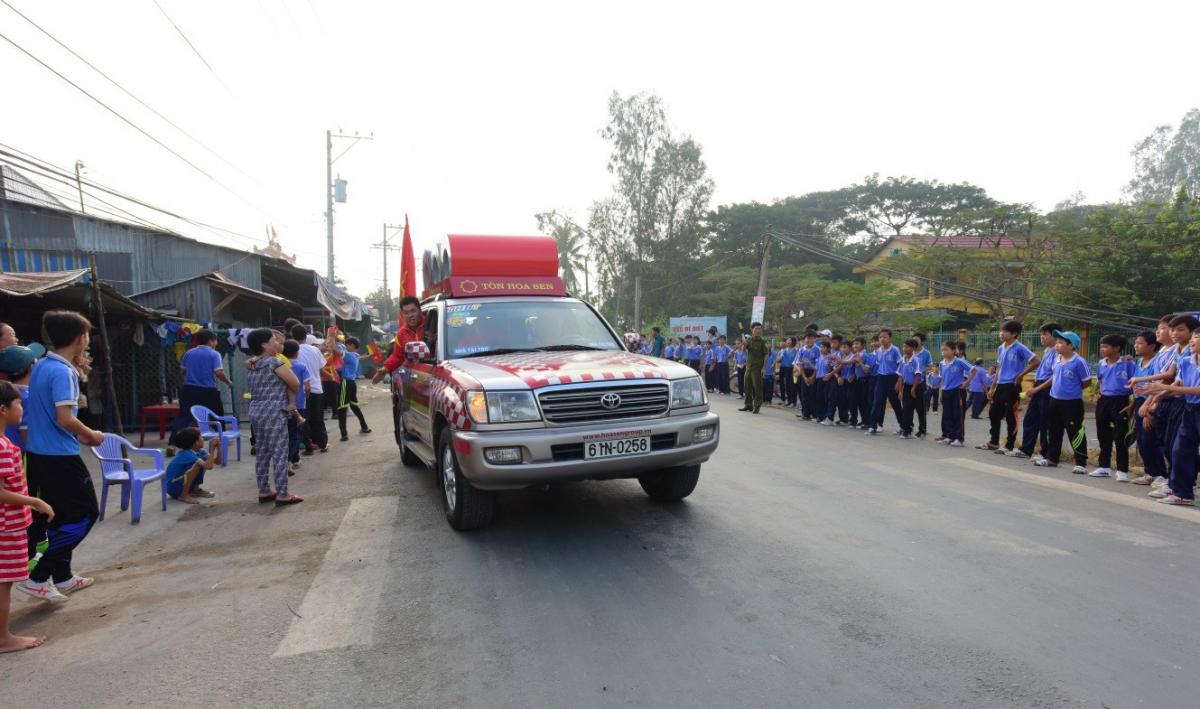 Nhân viên chi nhánh Tôn Hoa Sen tại Long Xuyên nhiệt tình chào đón đoàn đua đi qua