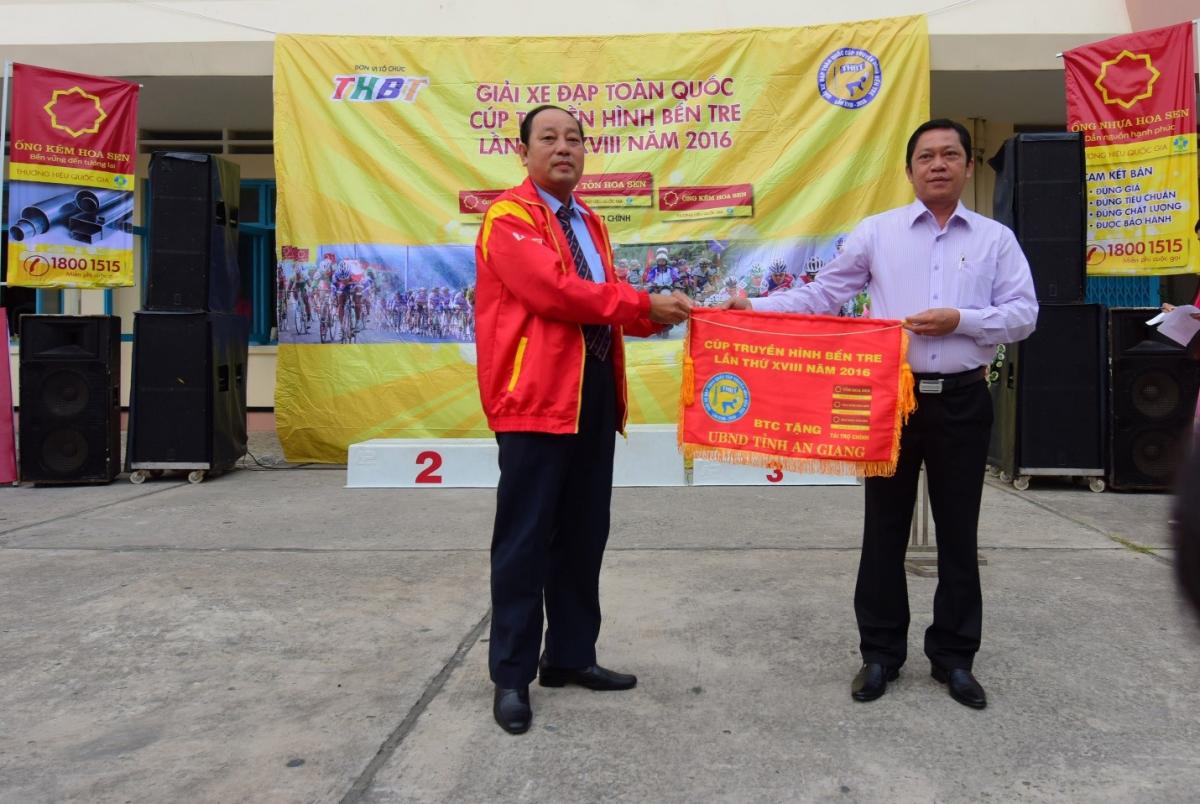 Ông Trần Văn Hữu, giám đốc Đài PTTH Bến Tre, Trưởng Ban tổ chức trao cờ lưu niệm cho đại diện lãnh đạo tỉnh An Giang