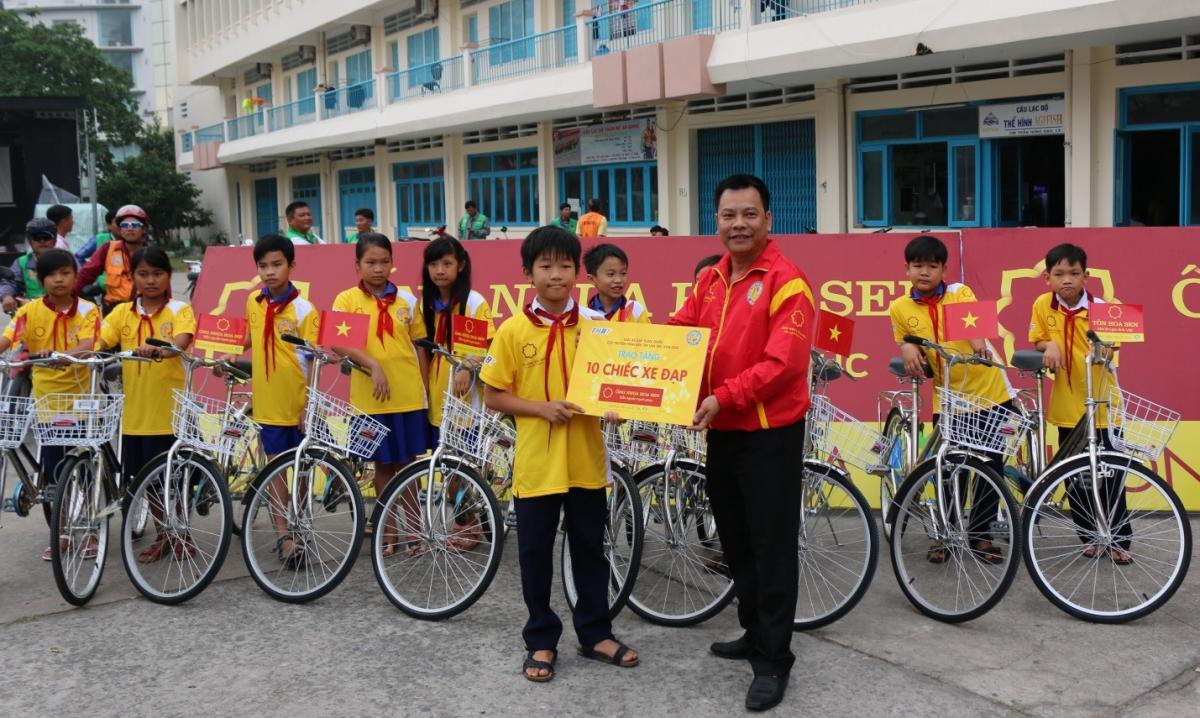Bên cạnh việc đồng hành cùng giải Xe đạp toàn quốc Cúp truyền hình Bến Tre lần thứ 18 năm 2016, Nhà tài trợ chính Tập đoàn Hoa Sen còn mong muốn lan tỏa những giá trị nhân văn sâu sắc tới cộng đồng thông qua việc tặng xe đạp cho học sinh nghèo hiếu học tại các địa phương thuộc các điểm đích đến. Sáng nay, Tập đoàn Hoa Sen đã trao tặng 10 chiếc xe đạp cho các em học sinh nghèo hiếu học tỉnh An Giang.