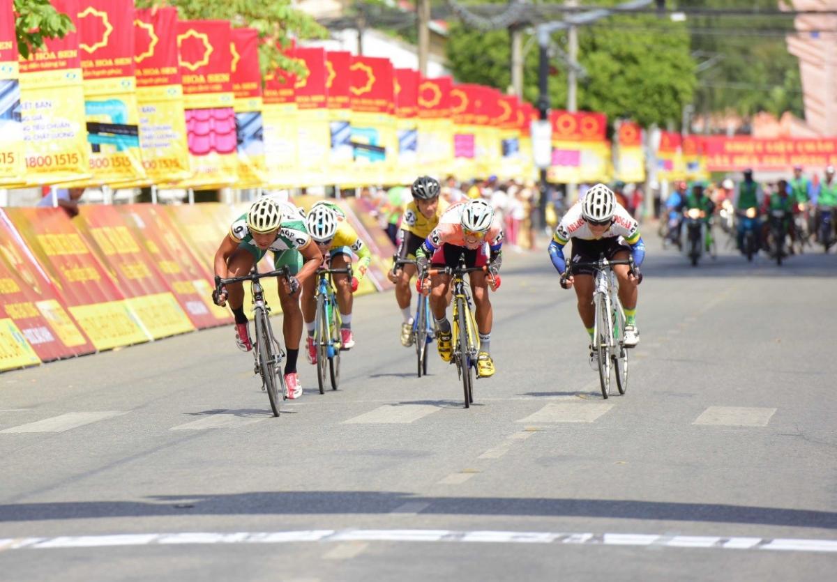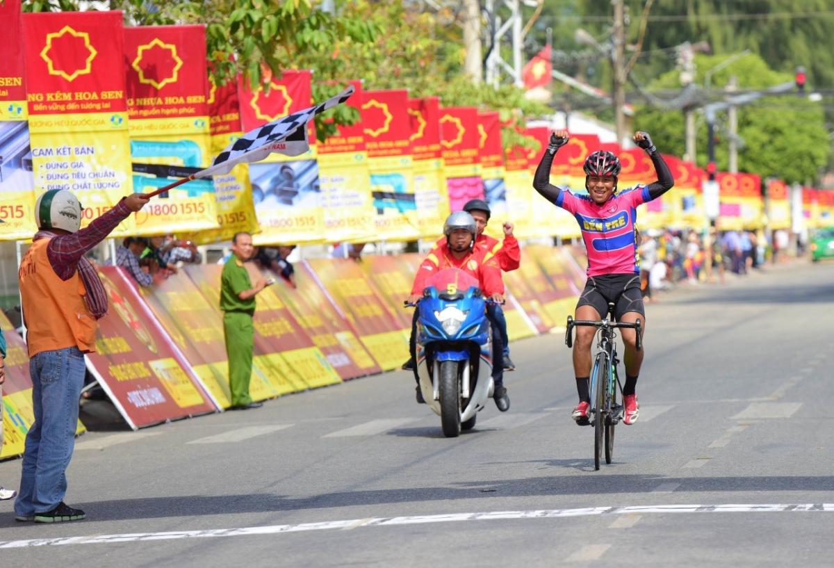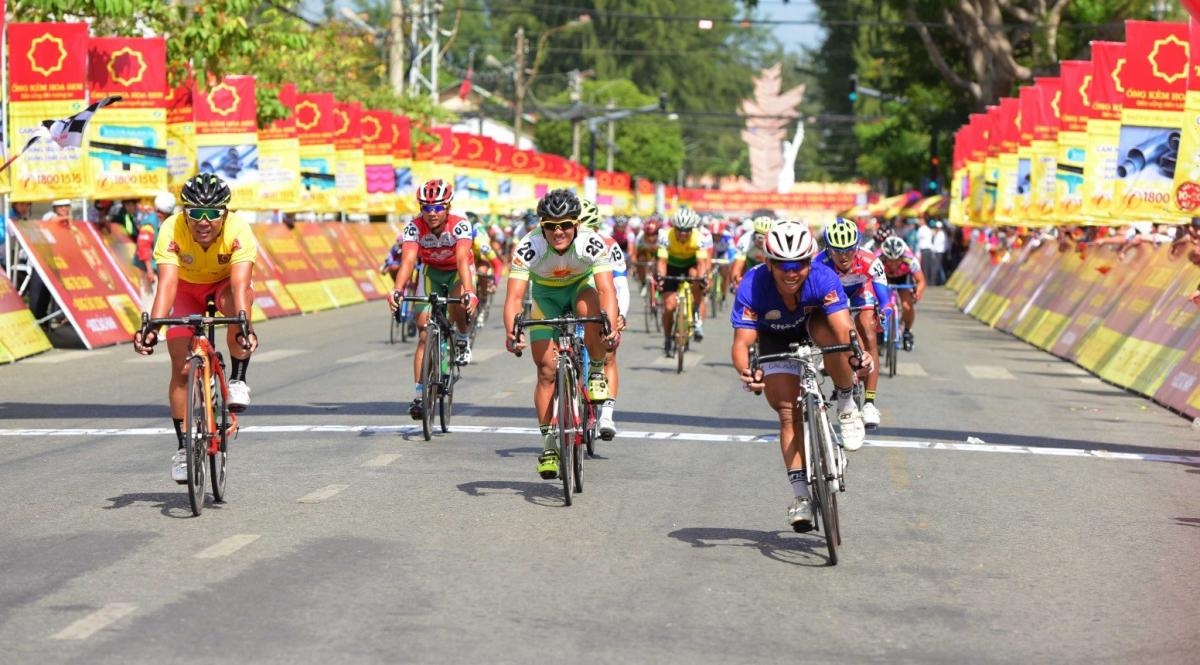 Tay đua Phạm Phát Đạt (số đeo 1) của đội Bến Tre đã tung nước rút về đích đầu tiên, ngay tại chính quê hương của mình