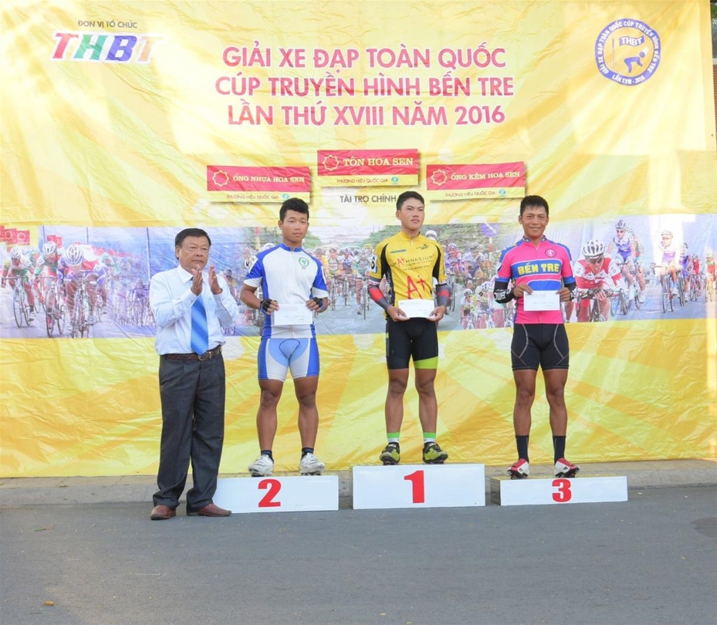 Ông Trần Văn Hữu, Giám đốc Đài PTTH Bến Tre, trưởng BTC trao giải cho 5 tay đua xuất sắc chặng 4. Tay đua trẻ Nguyễn Anh Khoa đã cán đích đầu tiên chặng này.