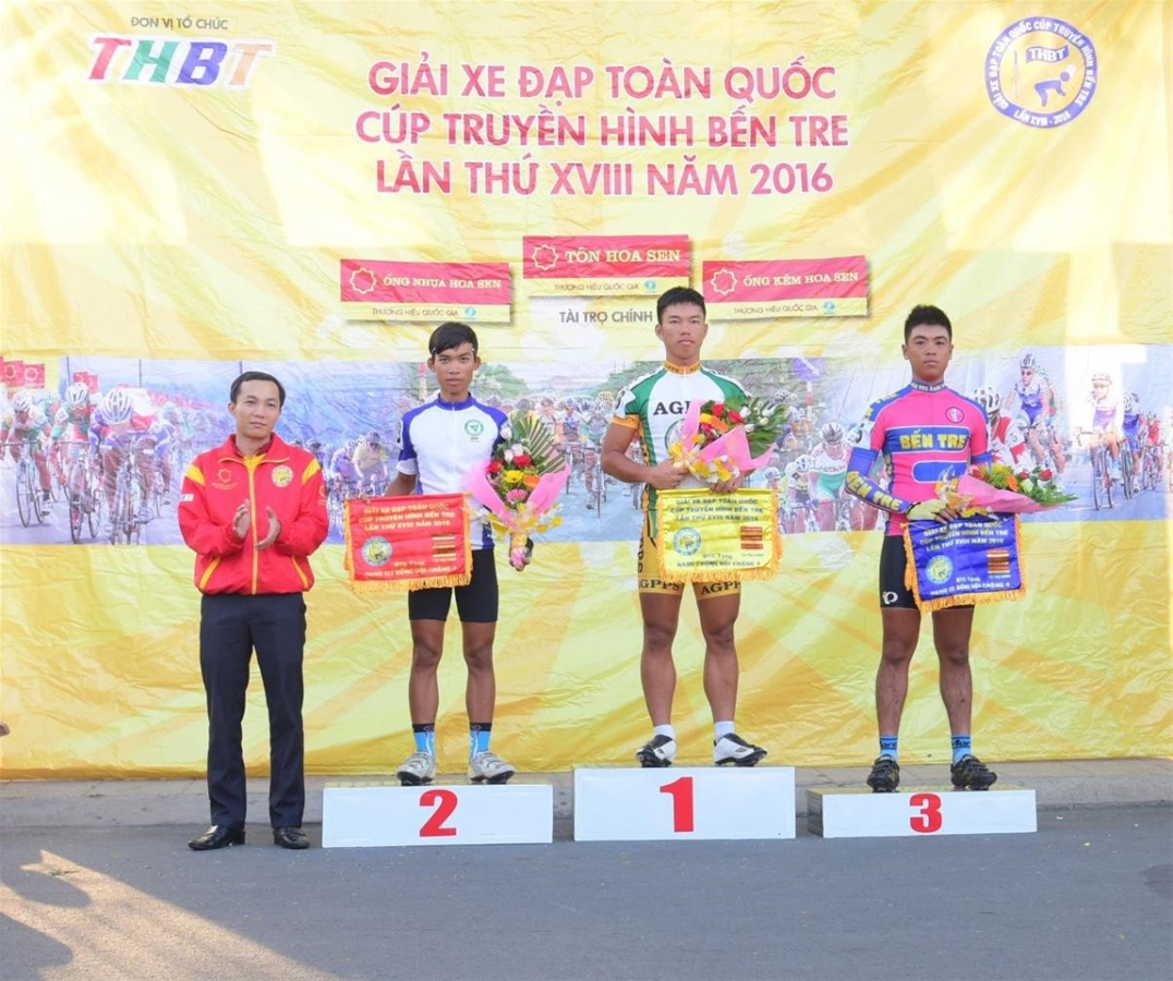 Ông Đặng Thái Hòa, Phó giám đốc Sở VHTT và Du lịch Cần Thơ trao giải Sprint tại Sóc Trăng cho các tay đua Nguyễn Anh Khoa, Sử Phương Toàn, Phạm Phát Đạt