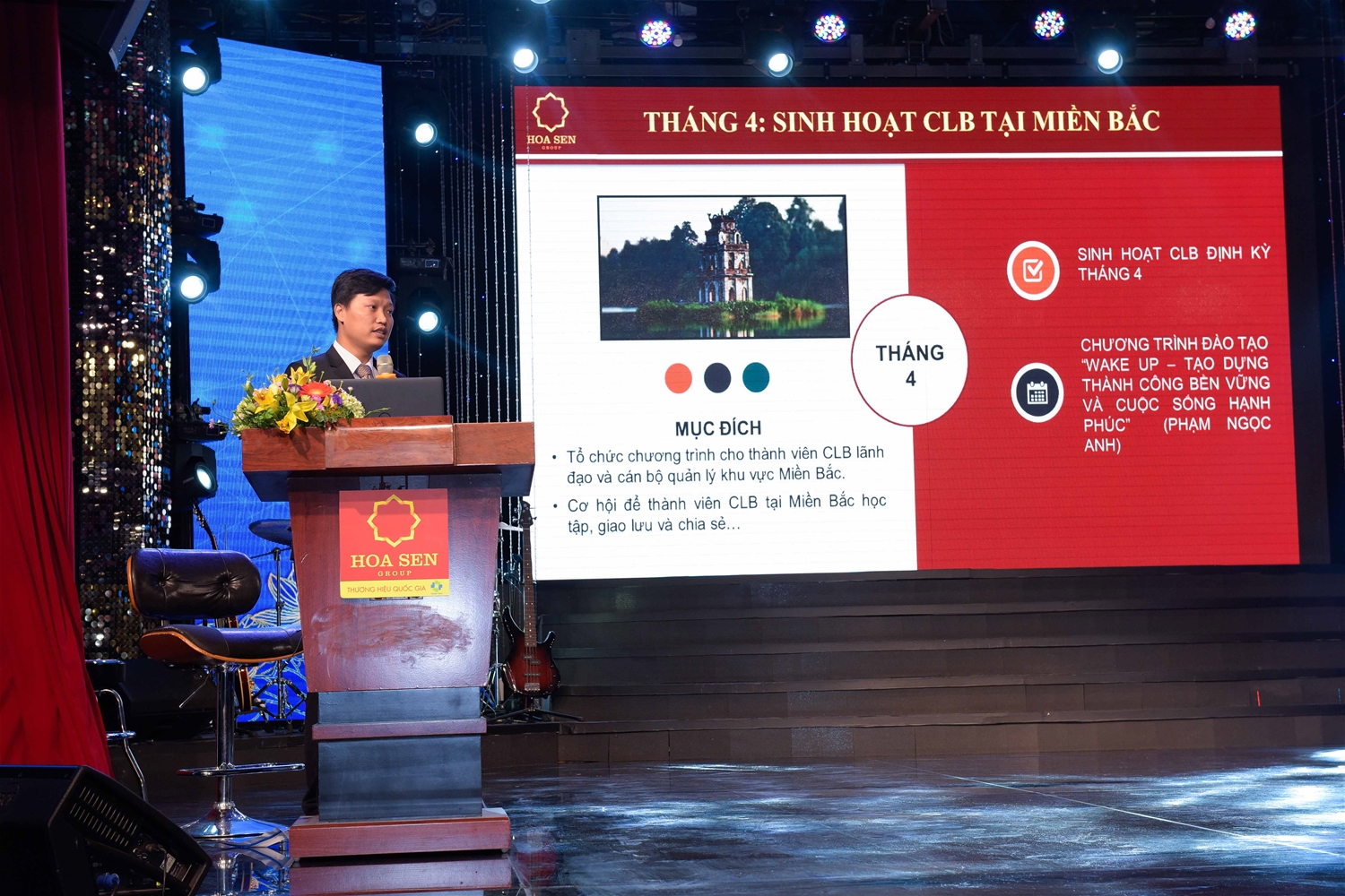 Có mặt trong chương trình, Ông Lê Phước Vũ – Chủ tịch HĐQT Tập đoàn Hoa Sen đã có những lời chỉ đạo sâu sắc cũng như những chia sẻ chân tình đến tất cả thành viên CLB Lãnh đạo, đặc biệt là đối với 21 CBCNV sắp đi đến các tỉnh mọi miền đất nước để nhận nhiệm vụ mới của Tập đoàn. Chủ tịch đã chia sẻ rằng ông cảm thấy rất vui và tự hào đối với chương trình, đối với CLB Lãnh đạo và hy vọng vào sự thành công rực rỡ của Hoa Sen trong tương lai.