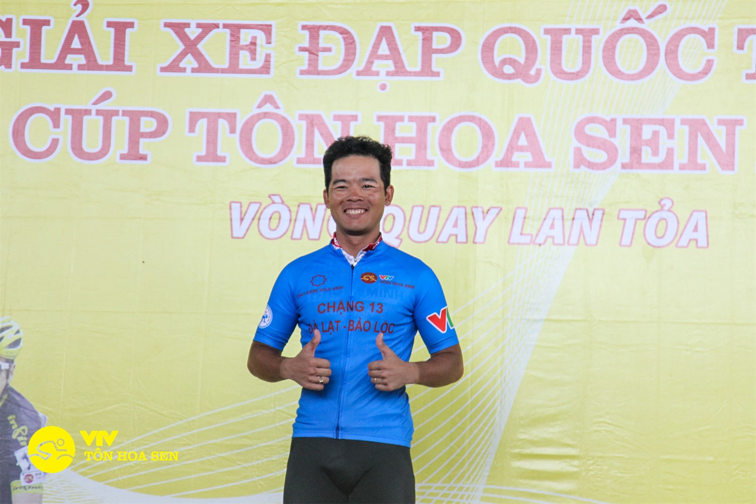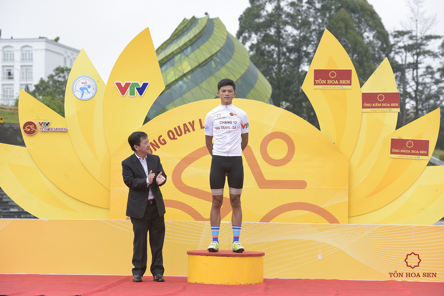 Ông Phan Văn Đa – tỉnh ủy viên, PCT UBND tỉnh Lâm Đồng trao giải Áo trắng sau 12 chặng cho VĐV Ngô Văn Phương đội Hà Nội