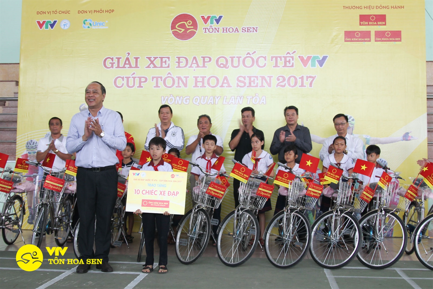 Đồng hành cùng giải đua, chương trình “Tôn Hoa Sen – Cùng em đi học” cũng đã trao tặng 10 chiếc xe đạp cùng 200 kg gạo cho các em học sinh hiếu học vượt khó tại tỉnh Lâm Đồng.