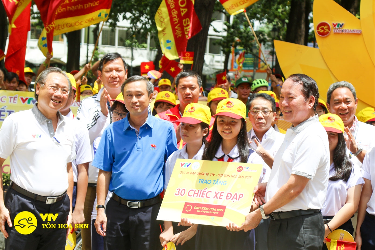 Tại đây, Chương trình “Tôn Hoa Sen – Cùng em đi học” đã trao tặng 30 chiếc xe đạp cùng 600 kg gạo cho các em học sinh hiếu học vượt khó tại  TP.HCM.