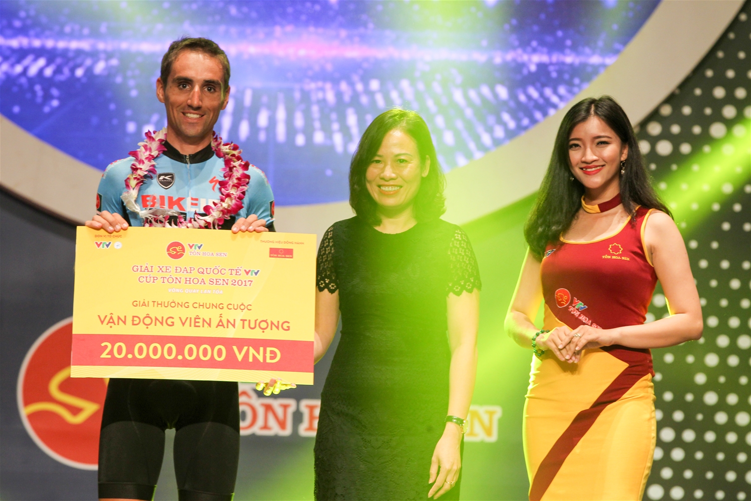 Bà Đỗ Lan Hương – Giám đốc Trung tâm Quảng cáo & Dịch vụ truyền hình Đài truyền hình Việt Nam trao giải ấn tượng cho VĐV Desriac Loic đội Bike Life VDC