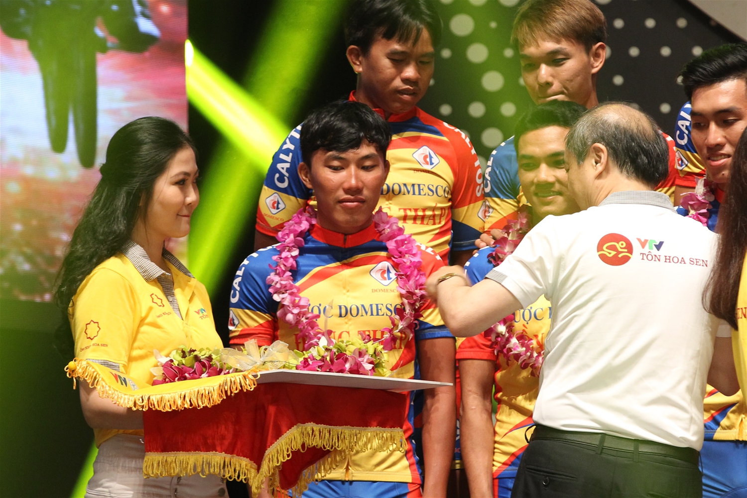 Ông Trần Đình Tài – Giám đốc Marketing Tập đoàn Hoa Sen trao giải Áo chấm đỏ sau 13 chặng cho VĐV Junrey Navarra đội CCN Cycling Team