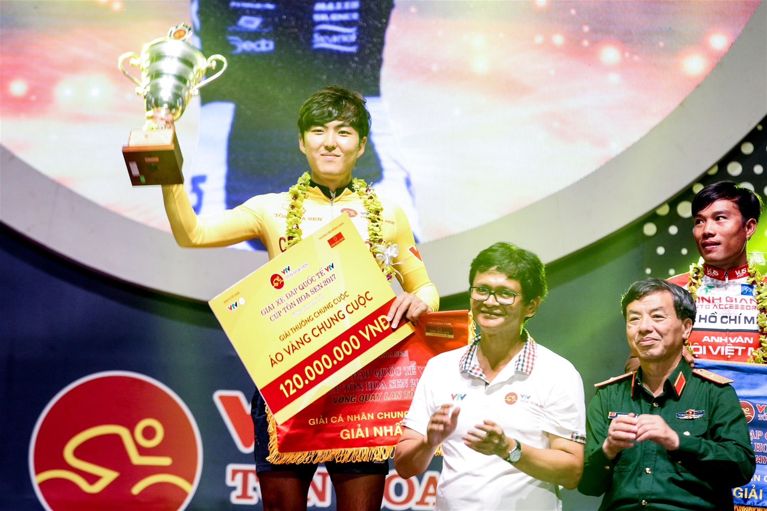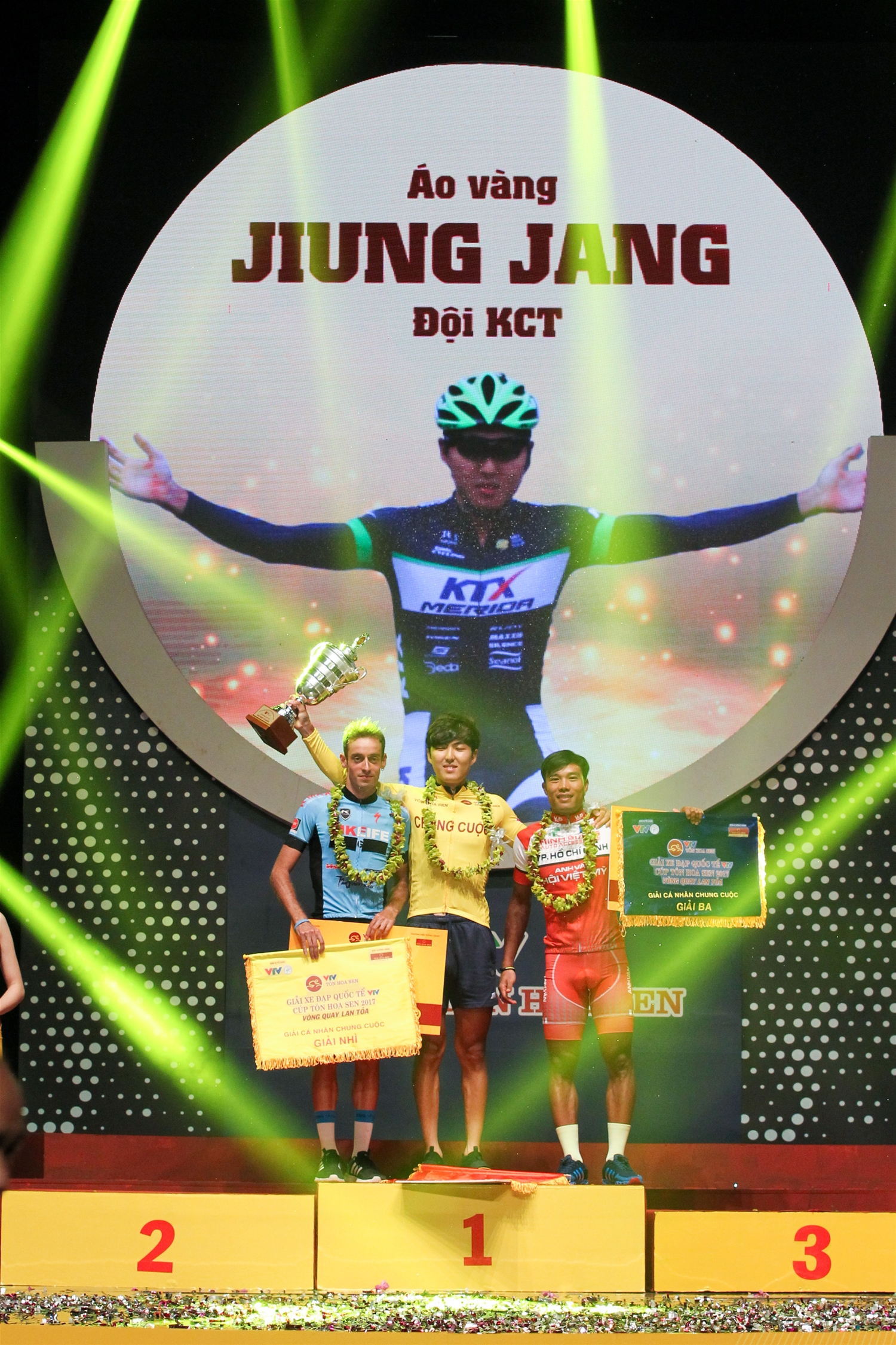 Và cuối cùng, giải thưởng được mong đợi nhất trong hành trình gần 1700 km chính là áo vàng chung cuộc. Đây là giải thưởng dành cho VĐV có tổng thời gian hoàn thành 14 chặng đua ngắn nhất. Năm nay, giải áo vàng chung cuộc đã thuộc về vận động viên người Hàn Quốc – Jiung Jang đội Korail Cycle.