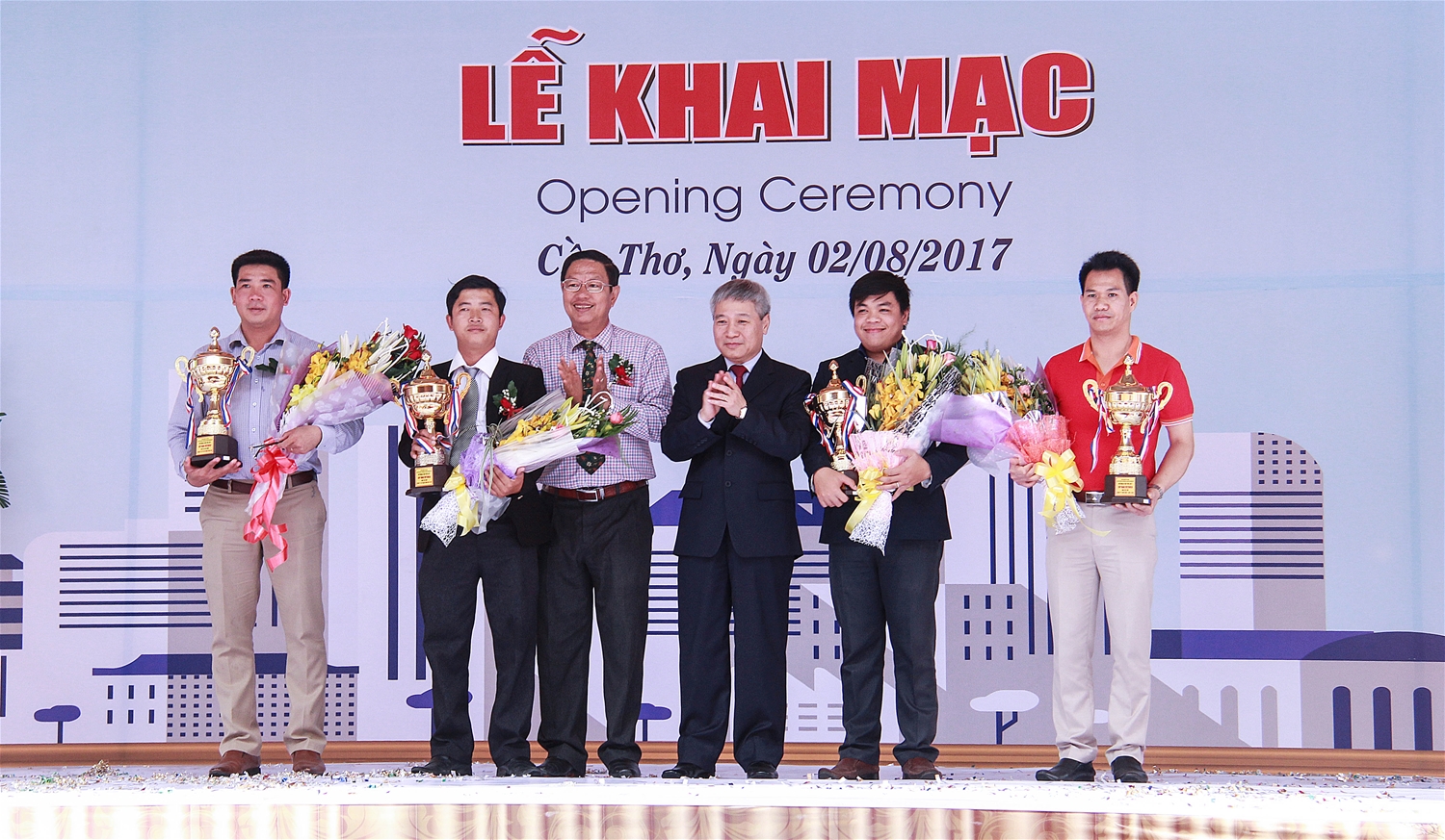 Ông Trương Đức Thắng – Phó Giám đốc KV Miền Tây – Đại diện Tập đoàn Hoa Sen nhận Hoa và Cup lưu niệm của Ban Tổ chức (Đứng thứ 2 từ bên phải sang)