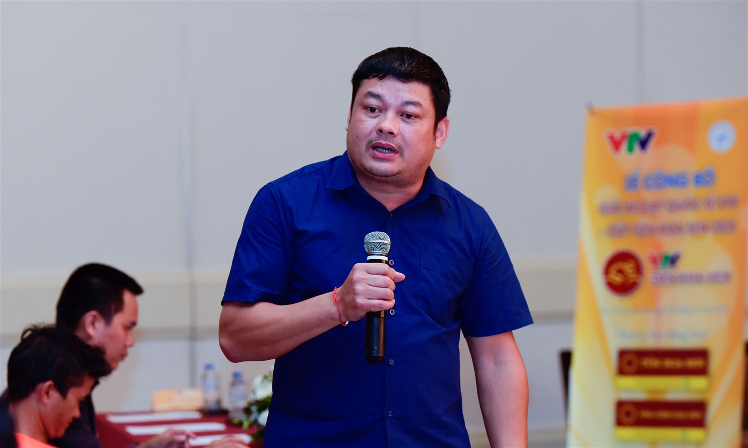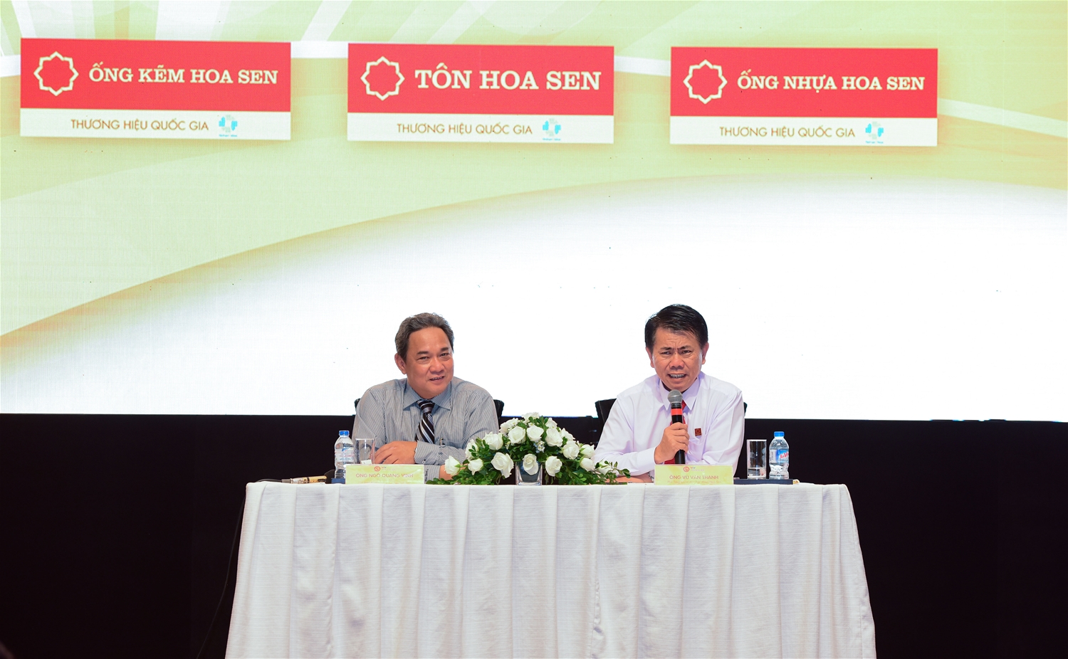 Ông Ngô Quang Vinh – Phó Chủ tịch Liên đoàn Xe đạp Mô tô Thể thao Việt Nam và Ông Vũ Văn Thanh – Phó Tổng Giám đốc Tập đoàn Hoa Sen trả lời phỏng vấn của cơ quan báo chí và các đội đua