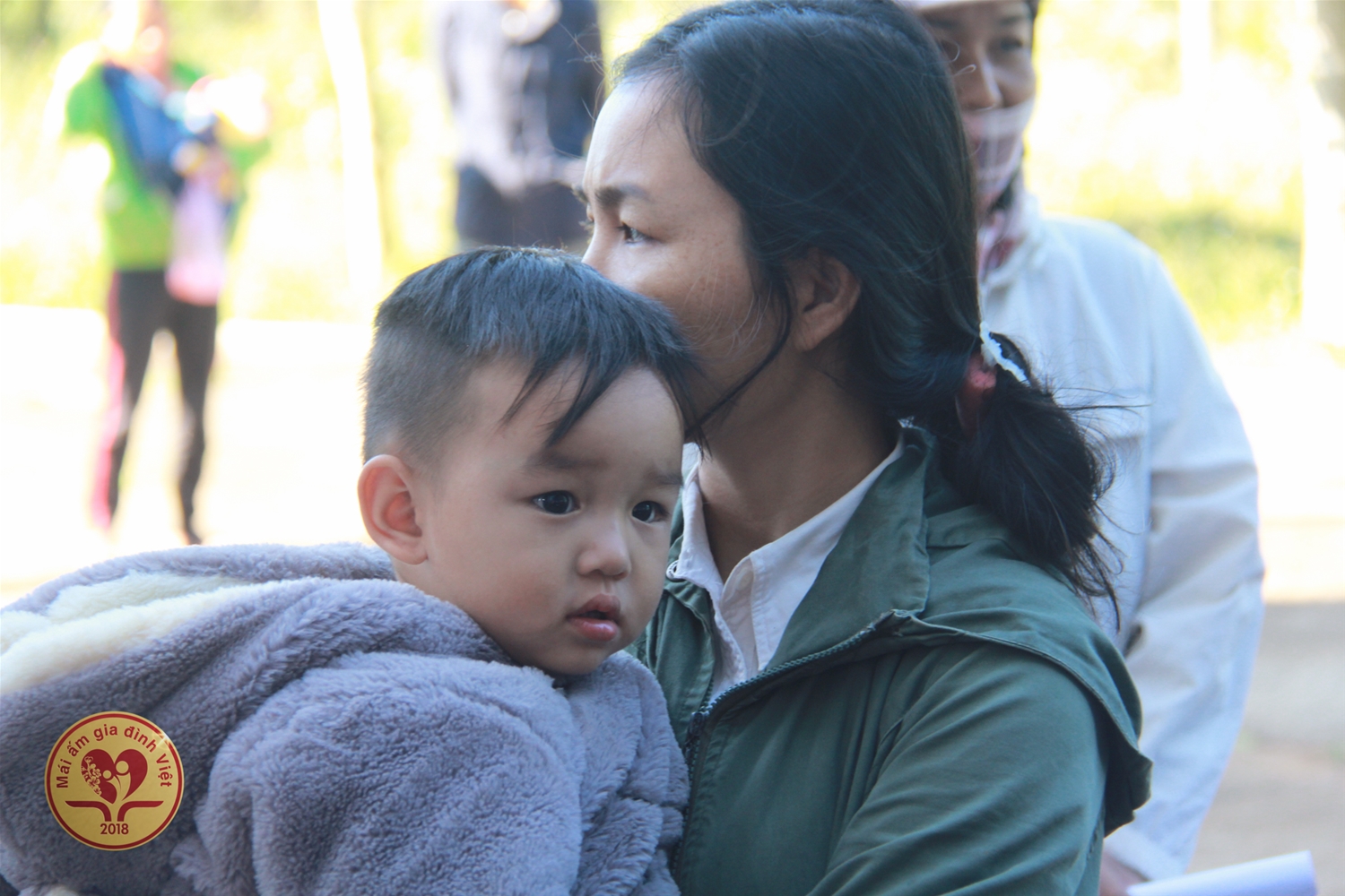 Em bé cùng mẹ đến chương trình từ sáng sớm