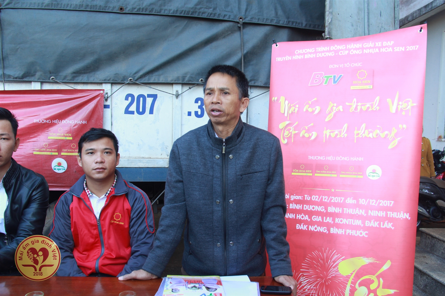 Ông Văn Cạnh – Chủ tịch UBND xã Bàu Cạn cảm ơn Tập đoàn Hoa Sen đã mang đến những phần quà ý nghĩa đến với bà con gặp khó khăn