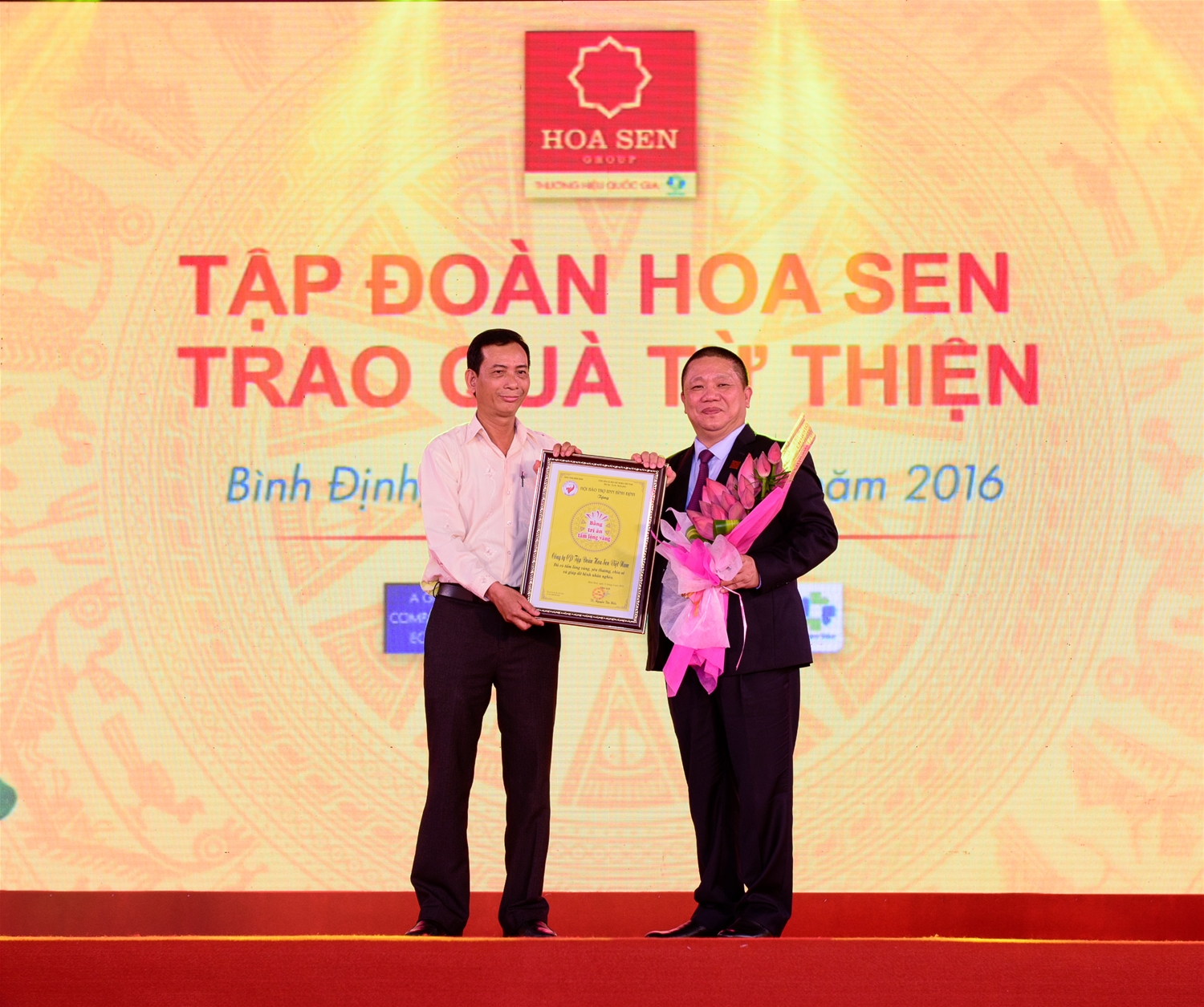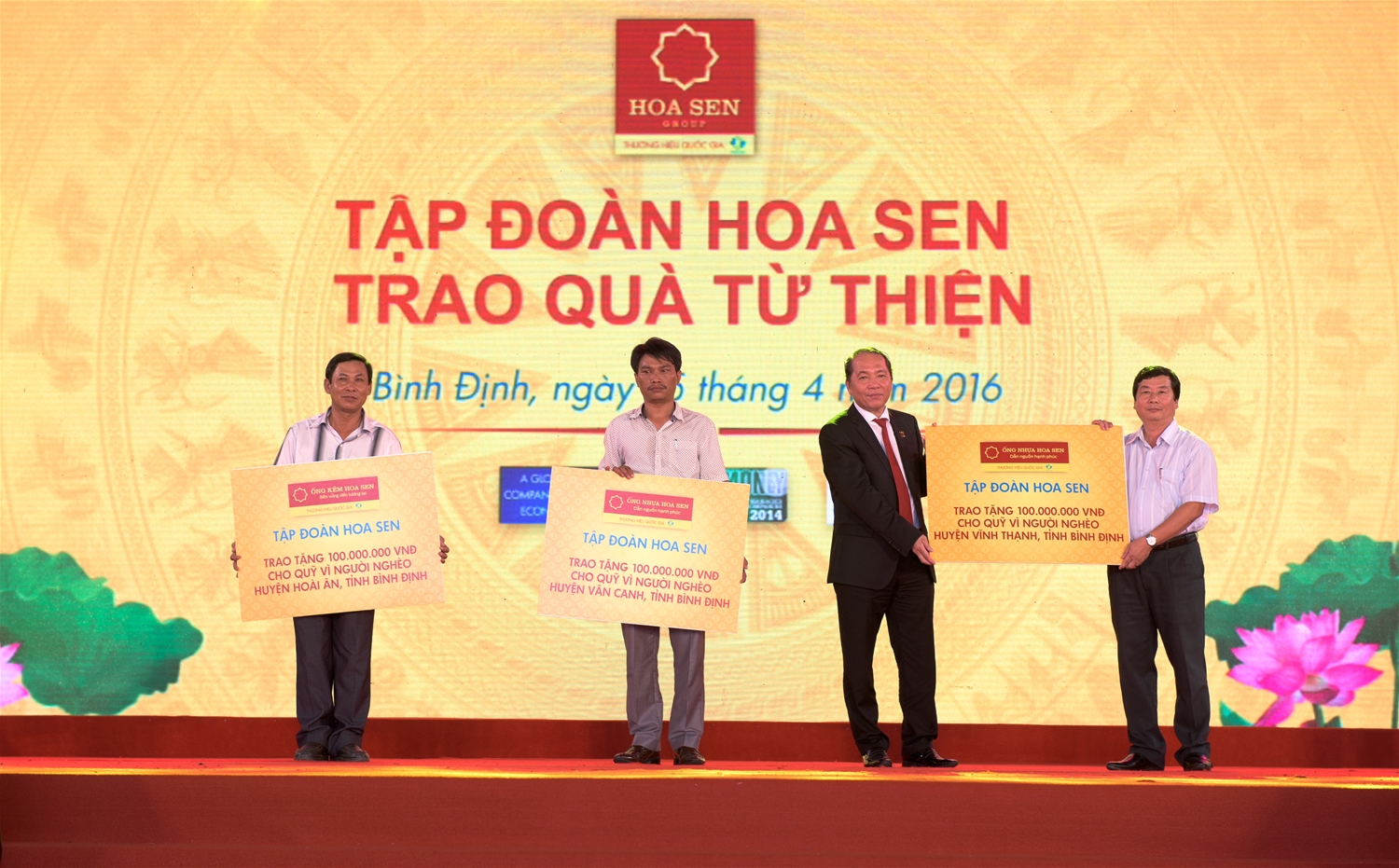 Tại buổi Lễ Khánh thành Nhà máy Ống nhựa Hoa Sen Bình Định, Tập đoàn Hoa Sen đã trao tặng: khu lưu trú thân nhân, bệnh nhân do Tập đoàn Hoa Sen xây dựng trị giá 1,4 tỷ đồng cho Bệnh viện Đa khoa tỉnh Bình Định; 150 triệu đồng cho Bếp ăn từ thiện của Bệnh viện Đa khoa Hoài Nhơn, huyện Hoài Nhơn, tỉnh Bình Định; 300 triệu đồng cho Quỹ vì người nghèo của 3 Huyện: Vĩnh Thạnh, Vân Canh, Hoài Ân thuộc tỉnh Bình Định (mỗi Huyện 100 triệu đồng); 300 triệu đồng cho Quỹ khuyến học của 3 Huyện: Hoài Ân, Tuy Phước, Phù Mỹ thuộc tỉnh Bình Định (mỗi huyện 100 triệu đồng); 50 xe đạp cho học sinh nghèo hiếu học tỉnh Bình Định trị giá 70 triệu đồng.