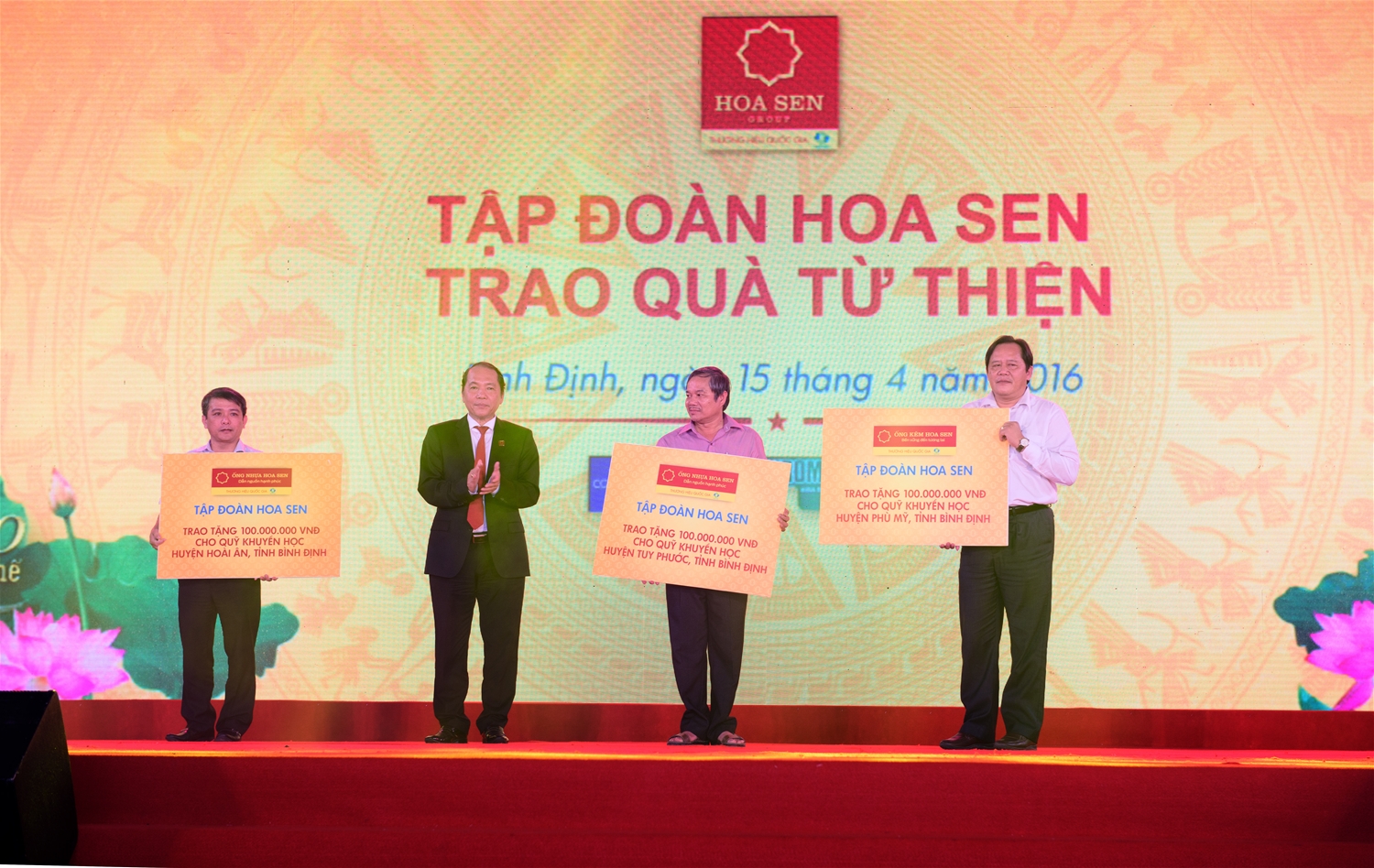 Tập đoàn Hoa sen trao tặng 300 triệu đồng cho Quỹ khuyến học của 3 Huyện: Hoài Ân, Tuy Phước, Phù Mỹ thuộc tỉnh Bình Định (mỗi Huyện 100 triệu đồng)