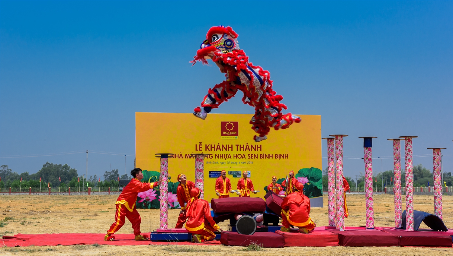 Trong tiếng trống dồn dập, lân và rồng múa chào mừng trên sân khấu, thời khắc quan trọng nhất của buổi lễ đã chính thức được diễn ra, đó chính là nghi thức cắt băng khánh thành nhà máy Ống nhựa Hoa Sen Bình Định. Nghi thức này đã đánh dấu thời điểm bắt đầu từ ngày hôm nay, Nhà máy Ống nhựa Hoa Sen Bình Định chính thức được khánh thành.