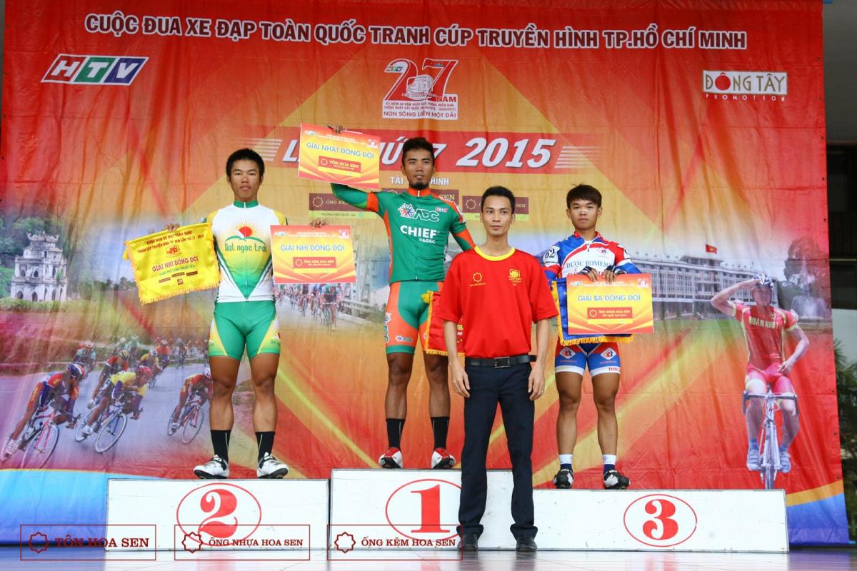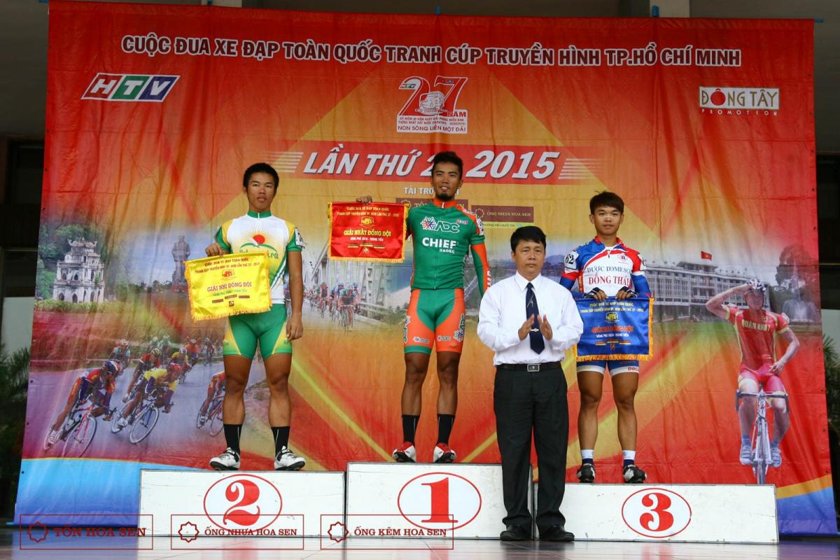 Ông Lê Hữu Thành, quyền giám đốc khu vực 2, đại diện Tập đoàn Hoa Sen trao giải đồng đội cho các đội đạt thành tích cao ở chặng đua thứ 8