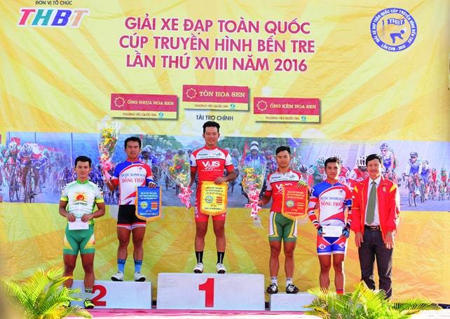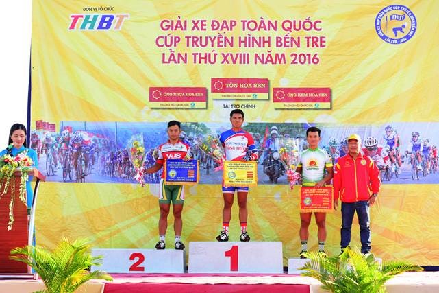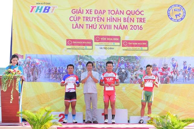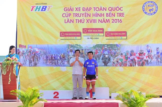 Ông Nguyễn Thiện Chí – Phó Giám đốc Sở VHTT & DL tỉnh Bến Tre, phó trưởng BTC trao giải cho 5 tay đua xuất sắc chặng 2