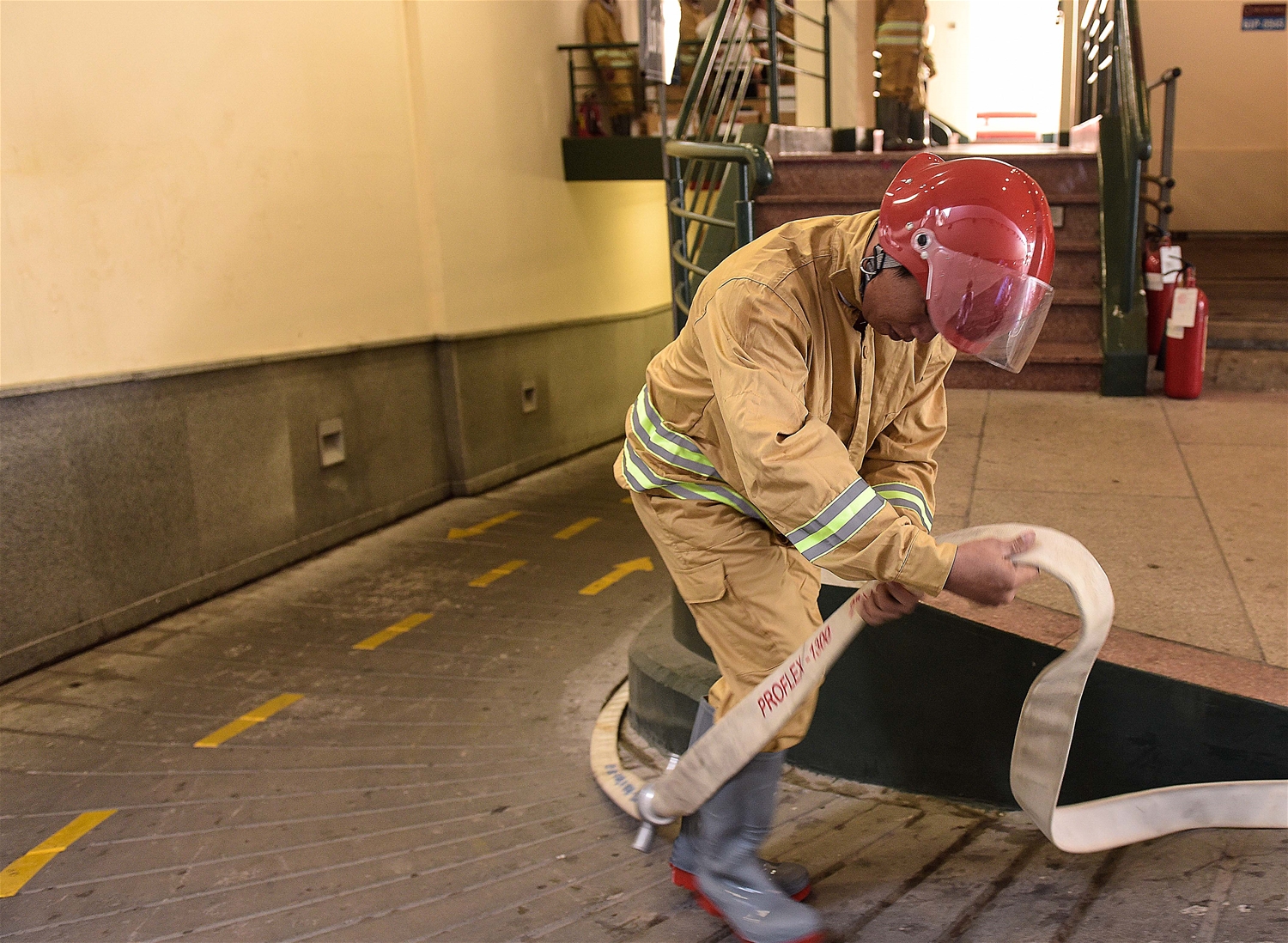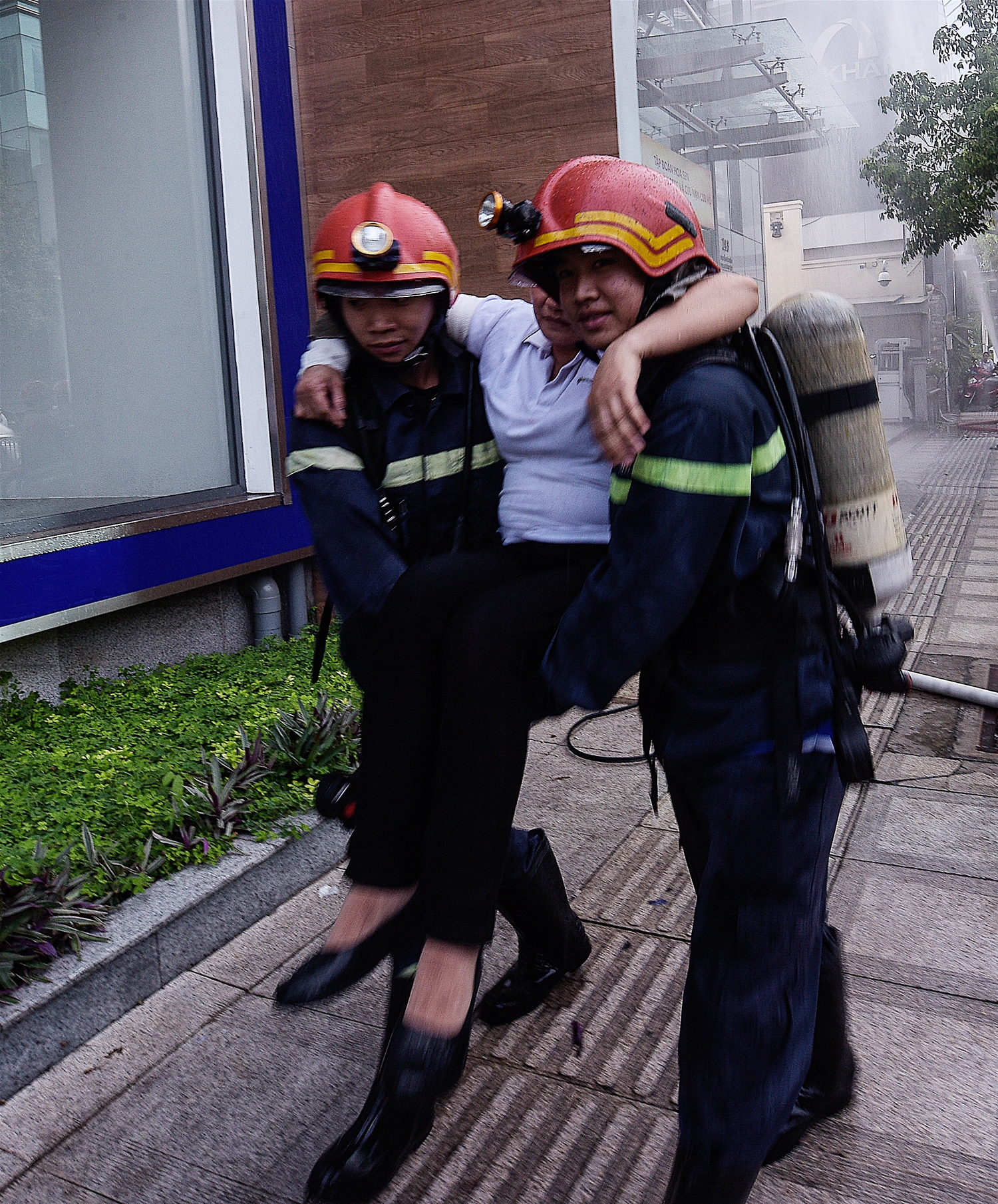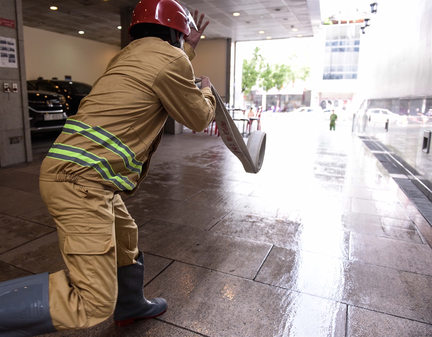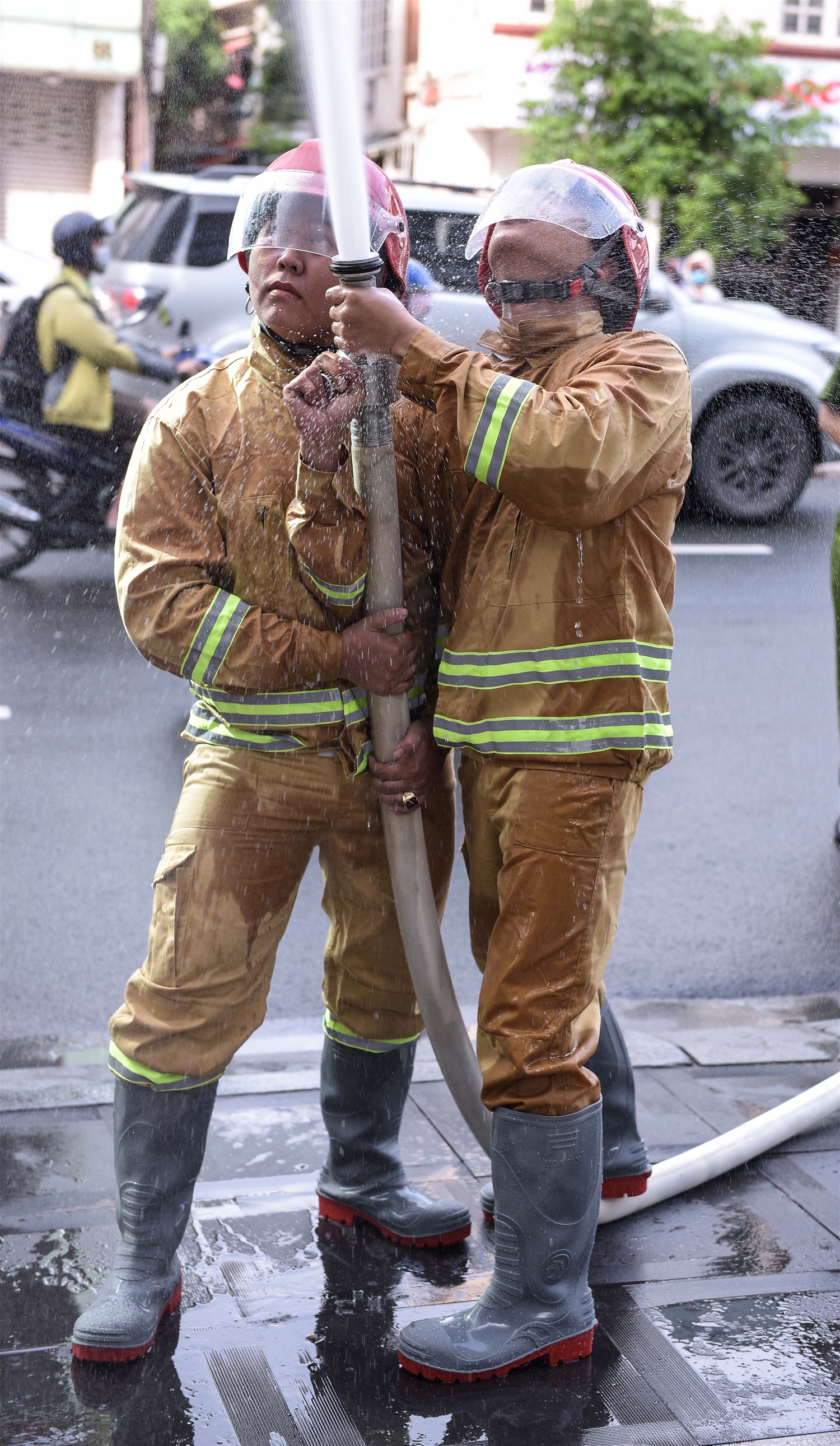 Đội chữa cháy cơ sở phối hợp với lực lượng chữa cháy chuyên nghiệp dập tắt đám cháy, bảo vệ an toàn cho người và tài sản trong tòa nhà