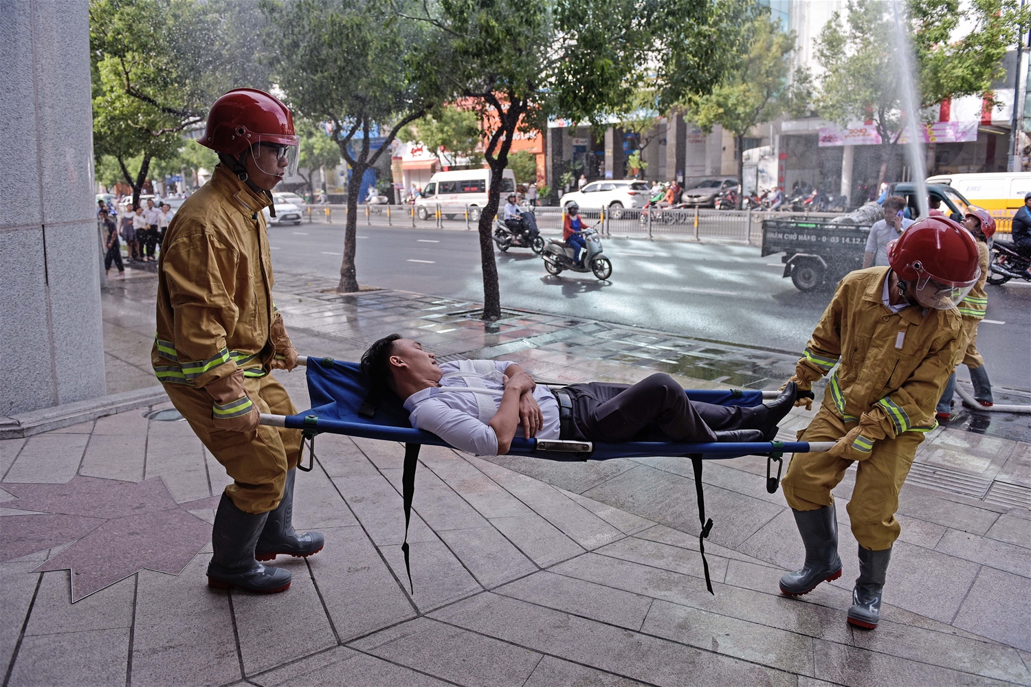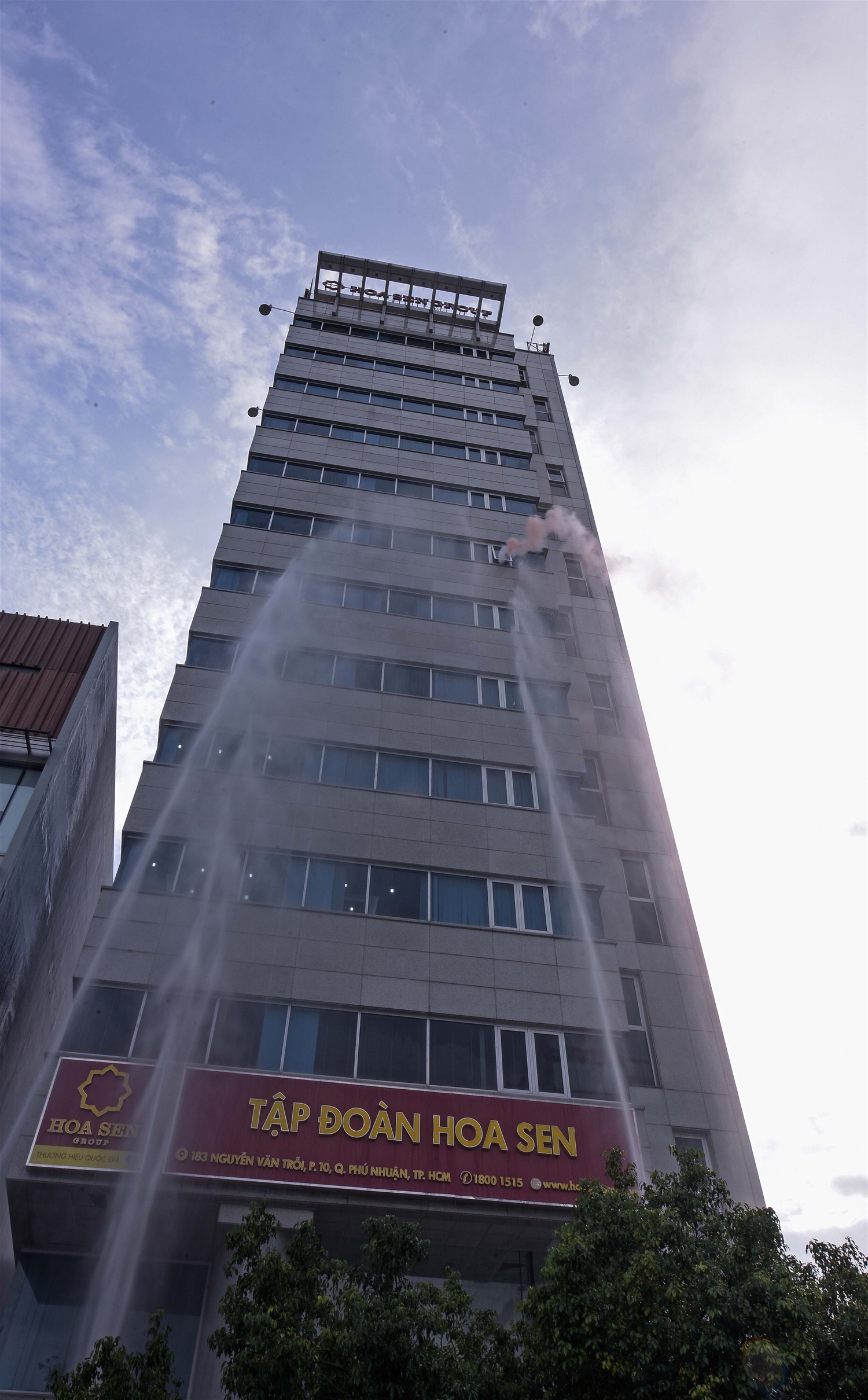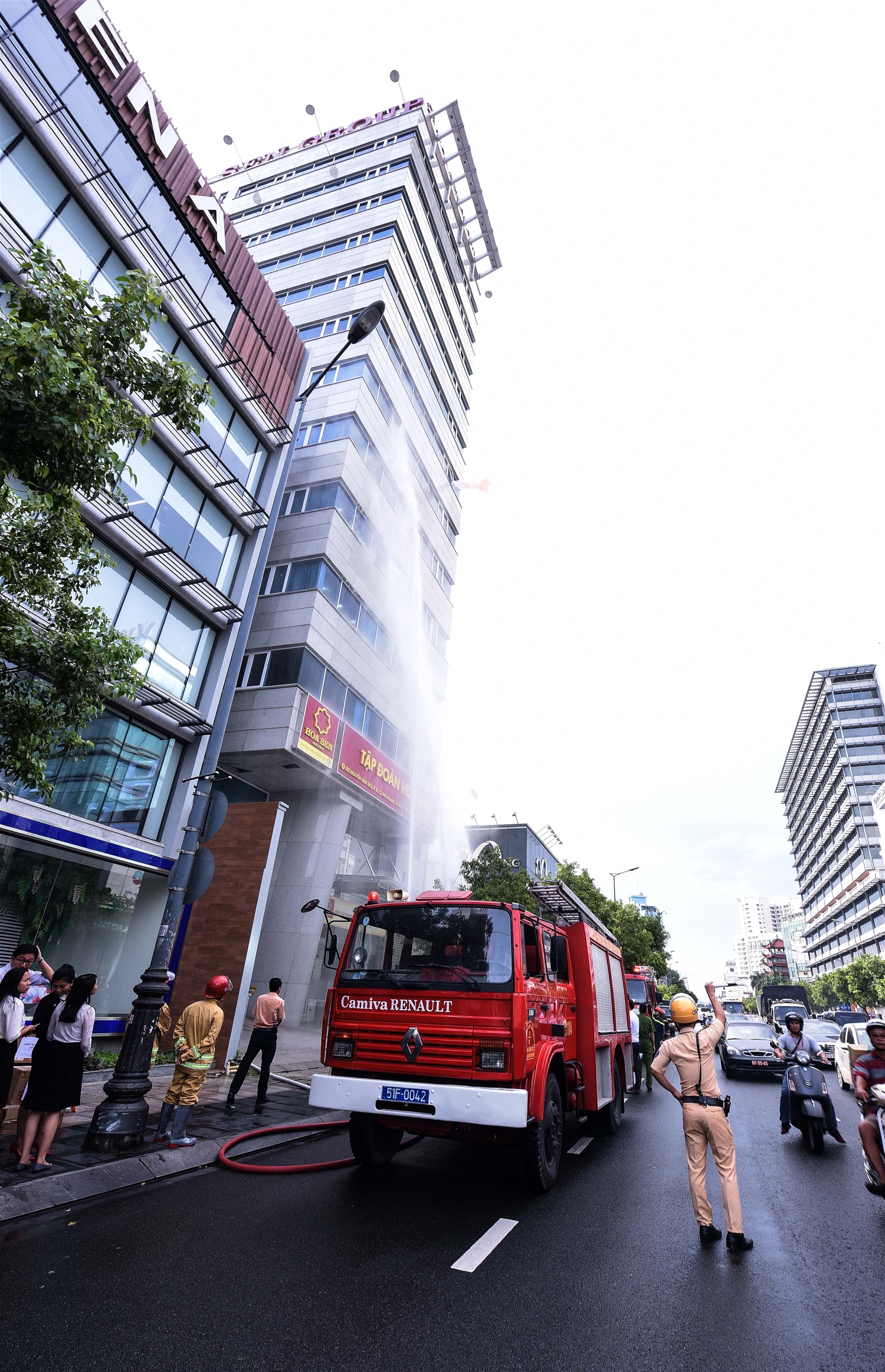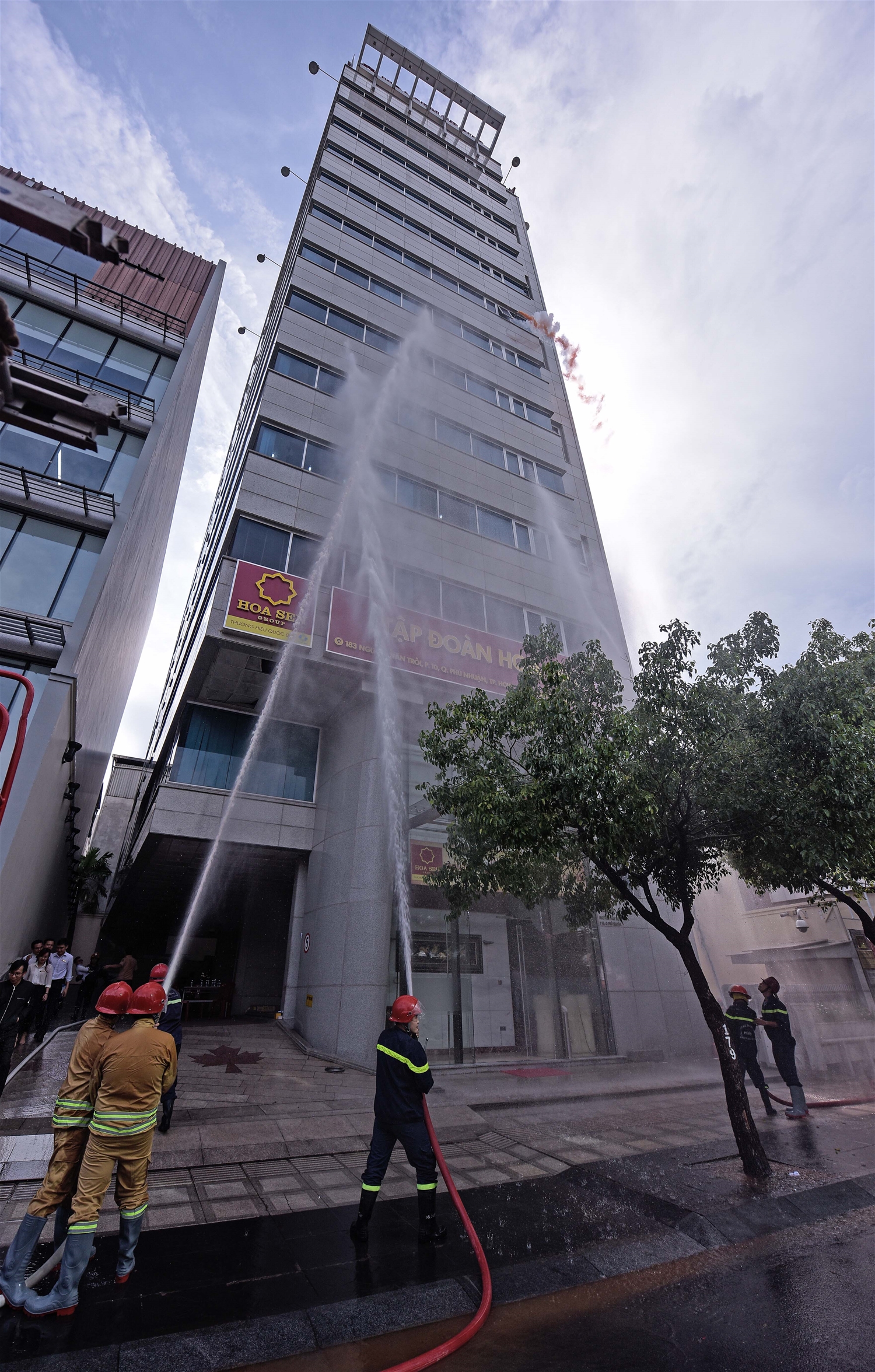 Đúng 15 giờ, những trái khói màu được giật kíp, giả định tình huống cháy phát sinh tại tầng 6 của tòa nhà Tập đoàn Hoa Sen. Hệ thống chuông báo cháy báo động, thông tin cháy nổ ngay lập tức được báo đến Đội cảnh sát PCCC quận Phú Nhuận. Đội PCCC cơ sở bắt đầu triển khai chữa cháy theo tình huống giả định. Đồng thời, tất cả nhân viên đang làm việc trên các tầng tại thời điểm đó nhanh chóng di tản theo 2 lối thoát hiểm phía trước và phía sau tòa nhà. Xe lực lượng PCCC xuống hiện trường, nhắm bắt tình hình và xử lý; Tổ chức cho các nạn nhân và di chuyển tài sản ra khu vực tập kết.