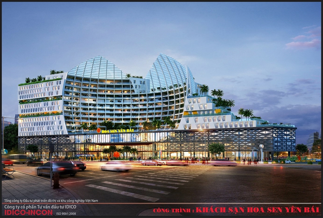 Up to this point, the project is considered as the largest trade center and hotel according to international standards in Yen Bai Province. It consists of a 15-storey commercial center and hotel, with a total floor area of 24,561 square meters, built into a complex providing various items such as: business center, convention center, 4-star hotel, wedding restaurant, coffee shop, and luxury apartment. The project design is a harmonious combination between the beauty of the North West mountains and symbols of Hoa Sen brand. The general structure is built in “step ladder” style, inspired by Mu Cang Chai terraced fields – a national landscape of Yen Bai Province. The central part is considered an image of three-petal lotus flower blooming, rising to create an impressive and outstanding highlight. By looking at the whole scene, the project demonstrates solidity of the step ladder architecture, as well as softness, elegance and grace of the lotus symbol to create a high class, sophisticated and modern architecture.