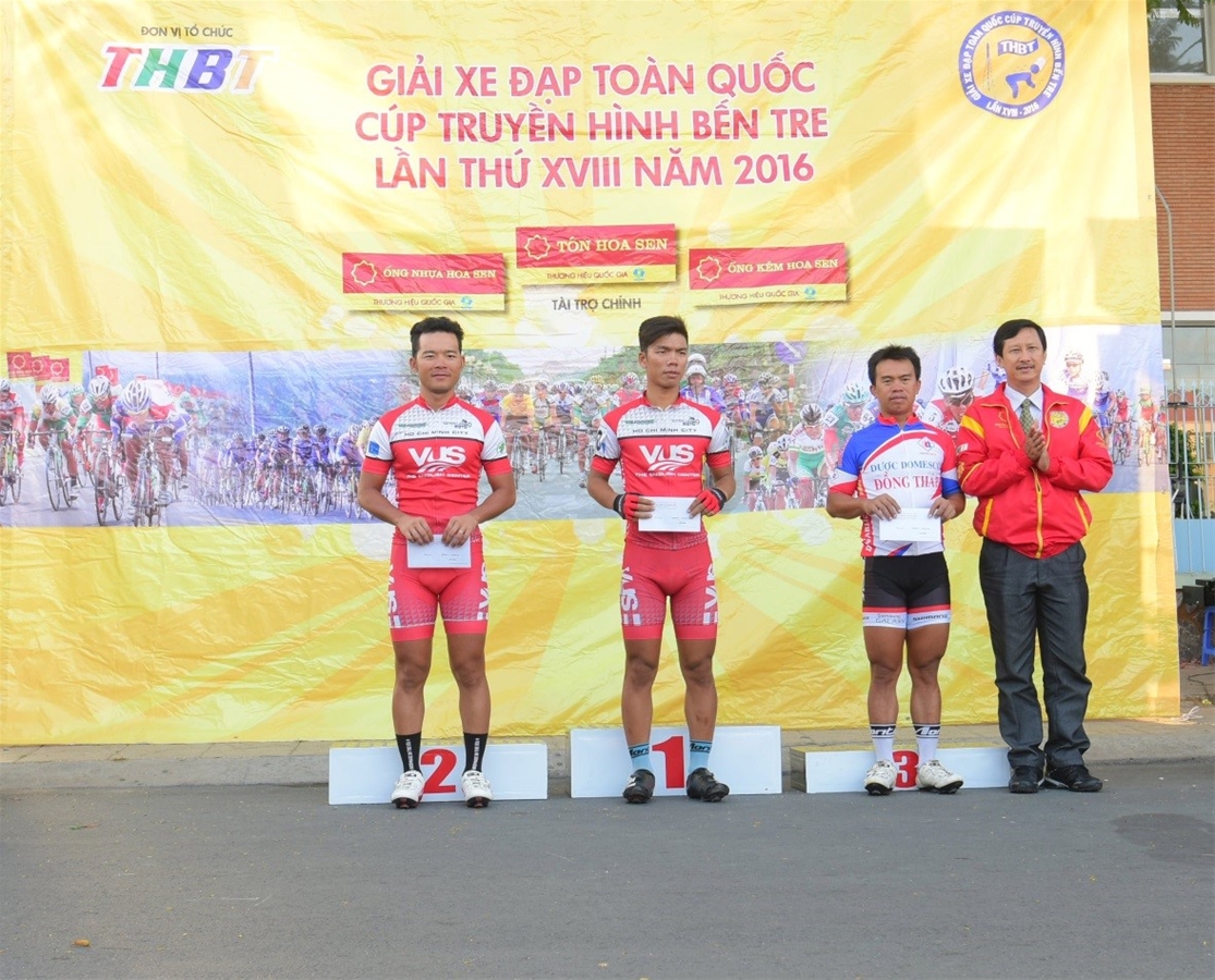 Ông Nguyễn Thiện Chí, Phó giám đốc Sở VHTT & Du lịch Bến Tre, phó trưởng BTC trao giải Spint tại Bạc Liêu cho các tay đua nổi bật của đội VUS HCM1 và Dược Domesco Đồng Tháp