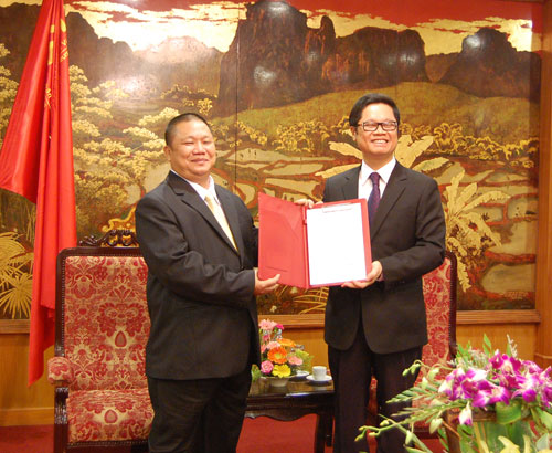 TS Vũ Tiến Lộc (bên phải) Chủ tịch VCCI trao quyết định thành lập Diễn đàn