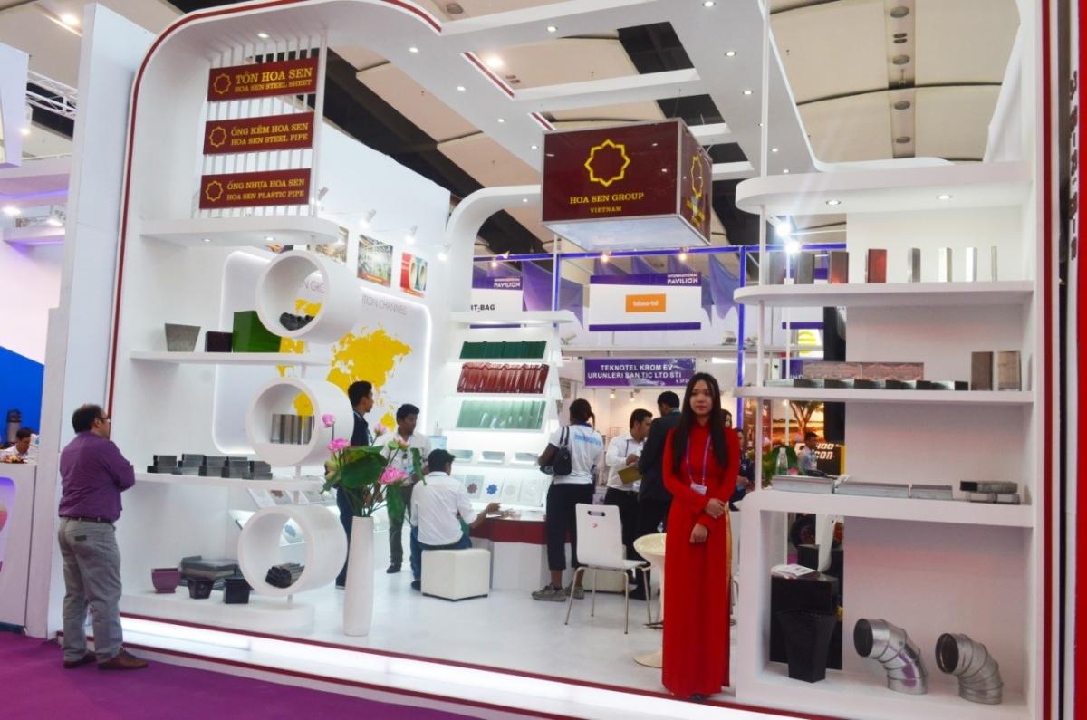 Tham gia Hội Chợ lần này Công Ty TNHH MTV VLXD Hoa Sen triển lãm và giới thiệu sản phẩm Ống thép Hoa Sen, Ống nhựa Hoa Sen và Phụ kiện Ống nhựa do Công ty sản xuất. Gian hàng được đặt ngay cổng chính dẫn vào Hội chợ cùng với sự đa dạng về mẫu mã trưng bày, cách trưng bày bắt mắt nên gian hàng của Công ty được đông đảo khách tham quan đến tìm hiểu về ưu điểm khác biệt của sản phẩm so với các doanh nghiệp cùng ngành và đặt quan hệ kinh doanh.