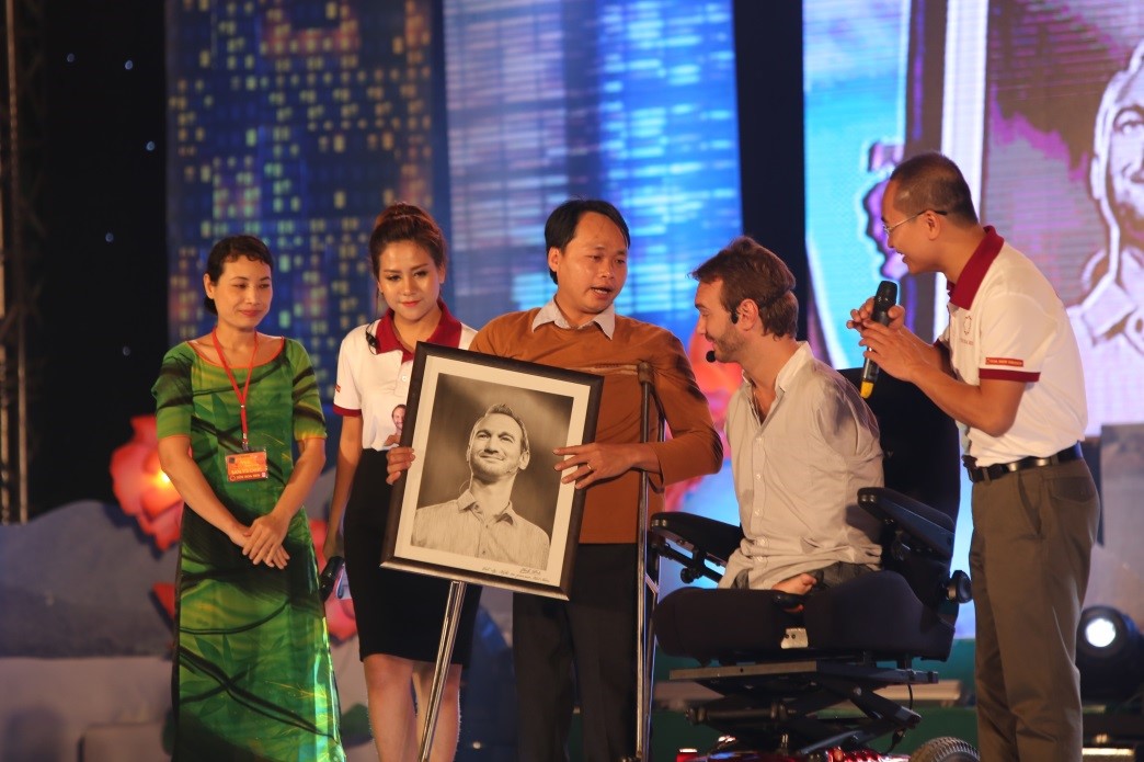 Tại buổi diễn thuyết, Nick đã có dịp giao lưu với họa sỹ Chu Vinh Đức (Tp Vinh) và em Nguyễn Đình Nhẫn (học sinh lớp 11, huyện Nghi Lộc, Nghệ An). Đây là 2 tấm gương khuyết tật nhưng đã vượt qua số phận để vươn lên học tập, rèn luyện, khẳng định bản thân mình.