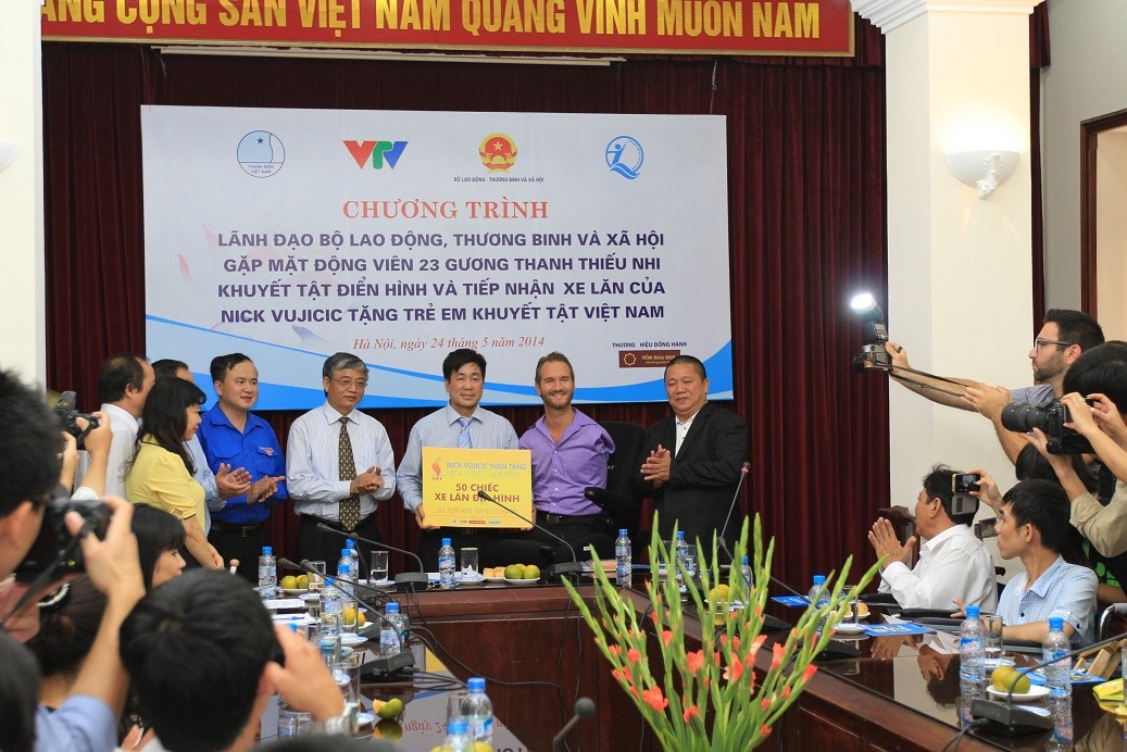 Đồng thời, Nick cũng trao tặng 50 xe lăn địa hình cho đại diện Quỹ bảo trợ trẻ em Việt Nam để giúp đỡ những người khuyết tật nhỏ tuổi, trong đó có bé Nguyễn Linh Chi. Trước đó, trong buổi giao lưu truyền thông giữa Ban Tổ chức chương trình Tỏa sáng nghị lực Việt với các phóng viên Báo, Đài ngày 20/5/2014, Nick cũng đã trao tặng 30 chiếc xe lăn địa hình cho người khuyết tật Việt Nam tại Thành phố Hồ Chí Minh.