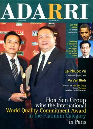 Hình ảnh ông Lê Phước Vũ (phải) và ông Vũ Văn Bình (trái) trên trang bìa tạp chí ADARRI Hình ảnh ông Lê Phước Vũ và ông Vũ Văn Bình giữ chặt chiếc cúp Bạch Kim trong tay trên trang bìa tạp chí ADARRI như khẳng định đẳng cấp và tầm vốc của Tập đoàn Hoa Sen – Việt Nam có thể sánh vai với các Tập đoàn khác trên toàn thế giới. Và với những gì Tập đoàn Hoa Sen đã làm trong chặng đường vừa qua là hoàn toàn xứng đáng với thành tựu này.