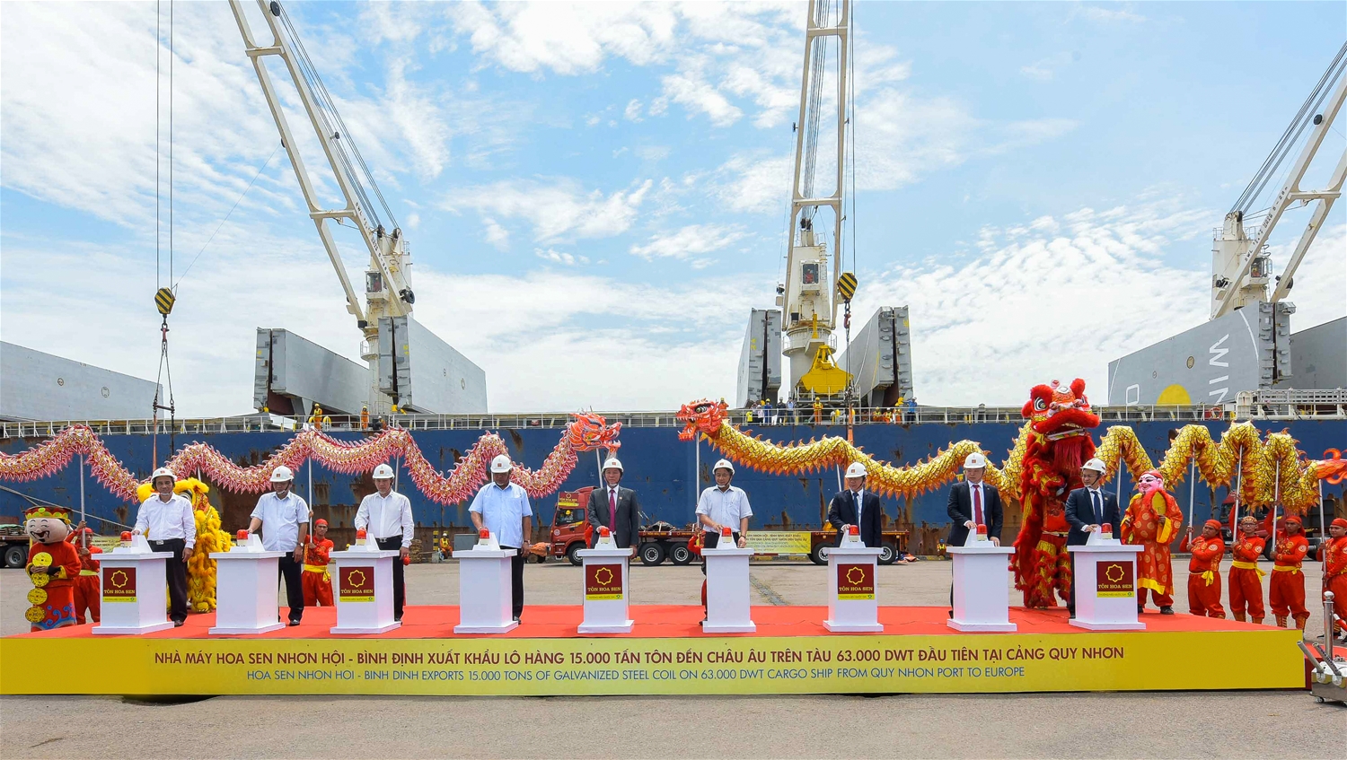 Nhà máy Hoa Sen Nhơn Hội – Bình Định xuất khẩu lô hàng 15.000 tấn Tôn đến Châu Âu trên tàu 63.000 DWT đầu tiên tại Cảng Quy Nhơn.