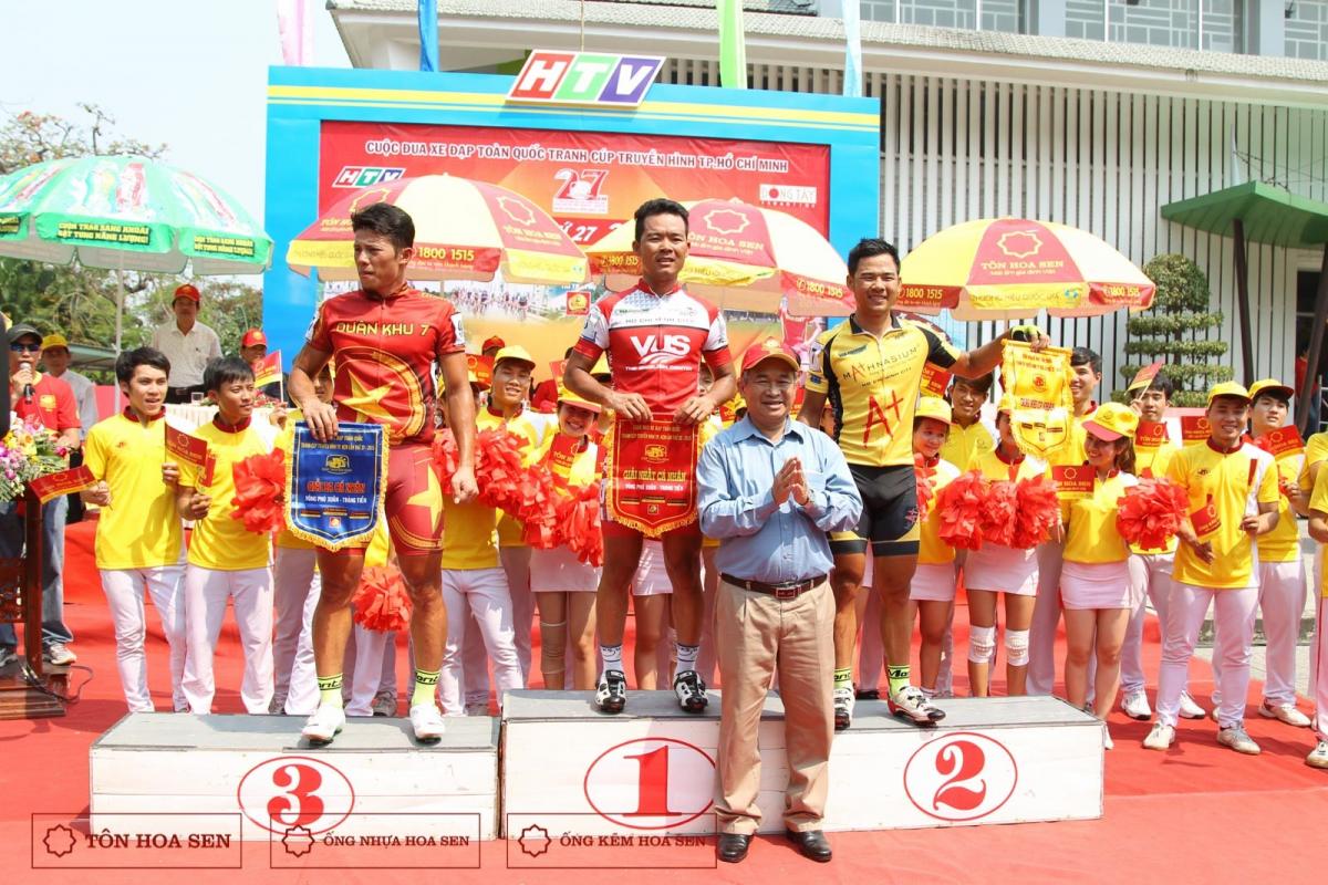 Ông Nguyễn Đức Minh, Giám đốc khu vực 3, đại diện Tập đoàn Hoa Sen trao giải đồng đội cho các đội đạt thành tích cao ở chặng đua thứ 7