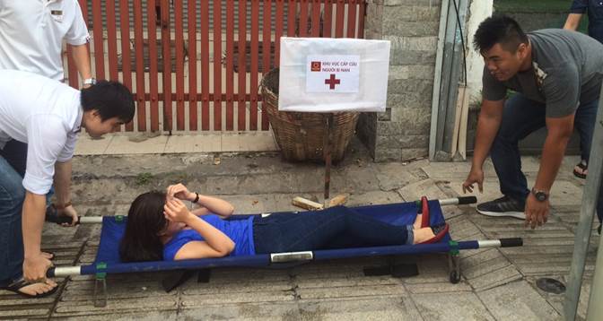 Đúng 15 giờ, những trái khói màu được giật kíp, giả định tình huống cháy phát sinh tại tầng 6 của tòa nhà Tập đoàn. Hệ thống chuông báo cháy, thông tin đến đội cảnh sát Phòng cháy chữa cháy quận Bình Thạnh được triển khai ngay sau đó từ 1 – 2 phút. Đồng thời, tất cả 460 nhân viên đang làm việc trên các tầng tại thời điểm đó nhanh chóng di tản theo 2 lối thoát hiểm, tầng lẻ theo cửa phía trước, tầng chẵn đi theo cửa phía sau.